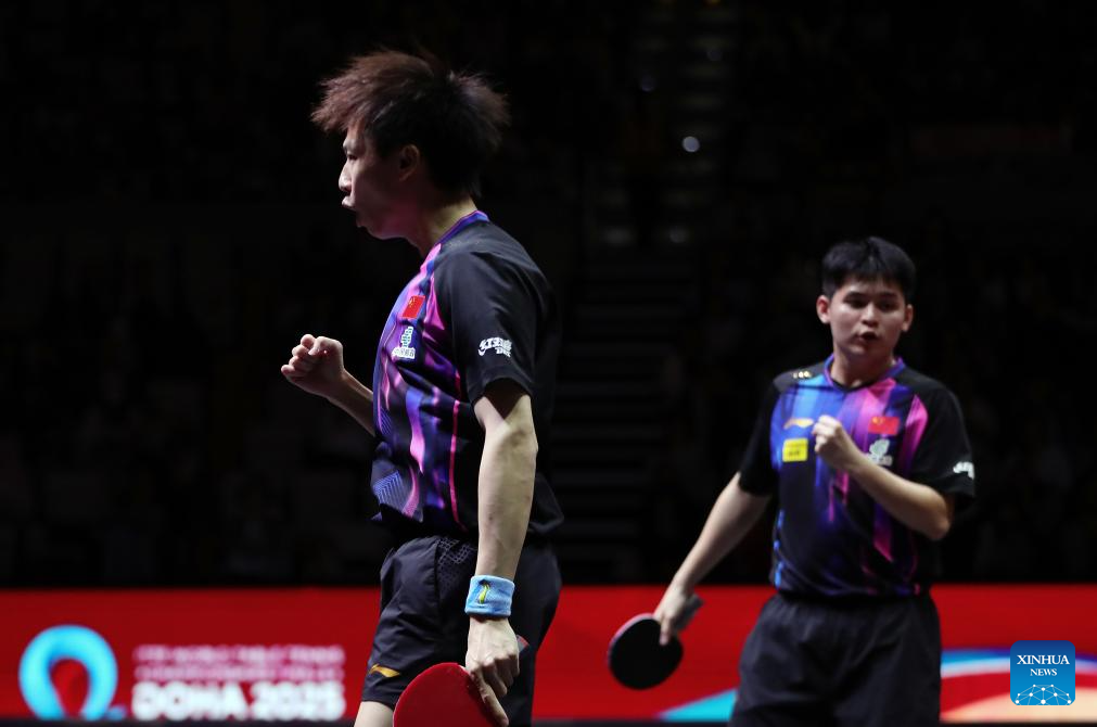 Lin Gaoyuan/Lin Shidong (R) celebrate during the men's doubles round of 16 match between Lin Gaoyuan/Lin Shidong of China and Jang Woojin/Cho Daeseong of South Korea at ITTF World Table Tennis Championships Finals Doha 2025 in Doha, Qatar, May 21, 2025. (Xinhua/Wang Dongzhen)