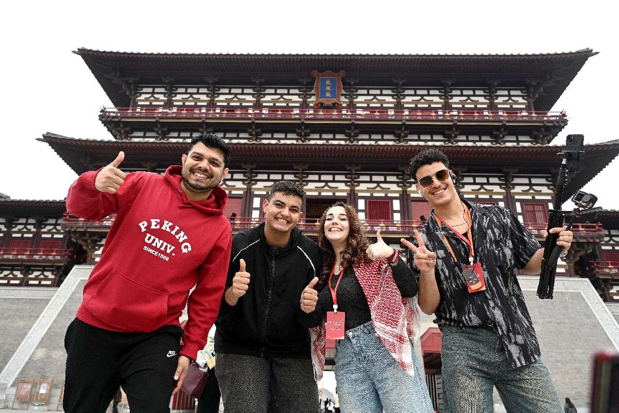 Foreign tourists pose for a picture at Suitang Luoyang City National Archeological Site Park in Luoyang, central China's Henan province, April 4, 2025. (Photo by Zhang Guanghui/People's Daily Online)