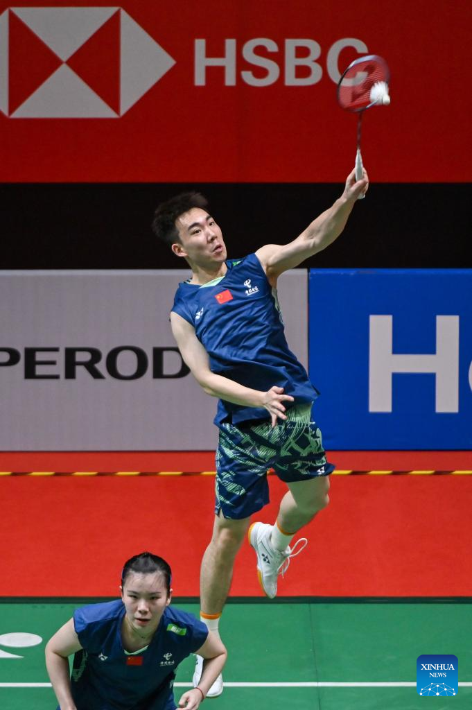 Guo Xinwa (L)/Chen Fanghui of China compete during the mixed doubles round of 16 match against Dejan Ferdinansyah/Siti Fadia Silva Ramadhanti of Indonesia at 2025 Malaysia Masters badminton tournament in Kuala Lumpur, Malaysia, May 22, 2025. (Photo by Chong Voon Chung/Xinhua)