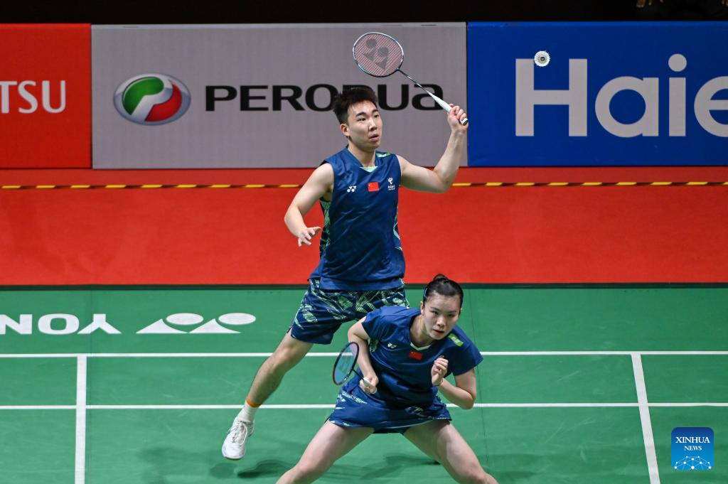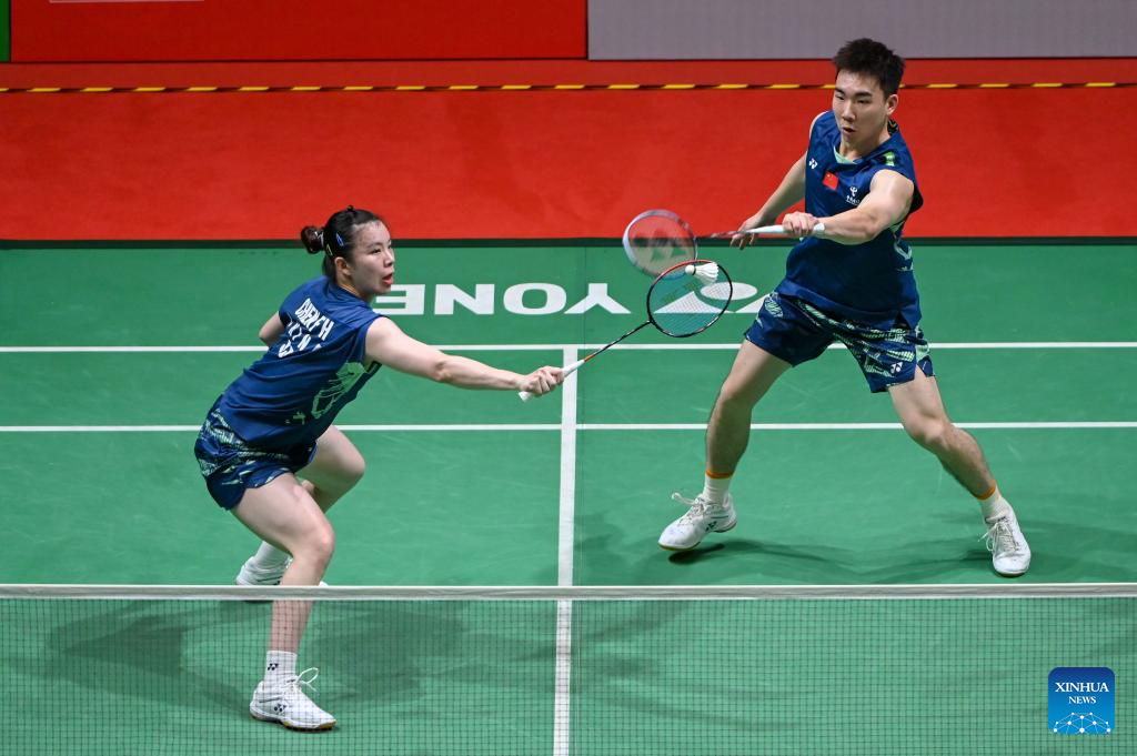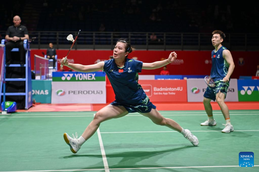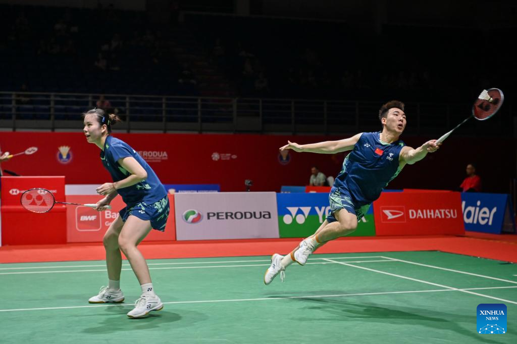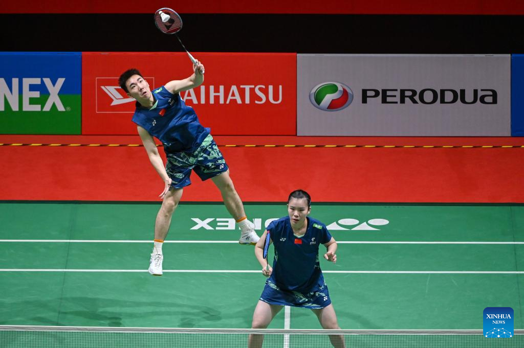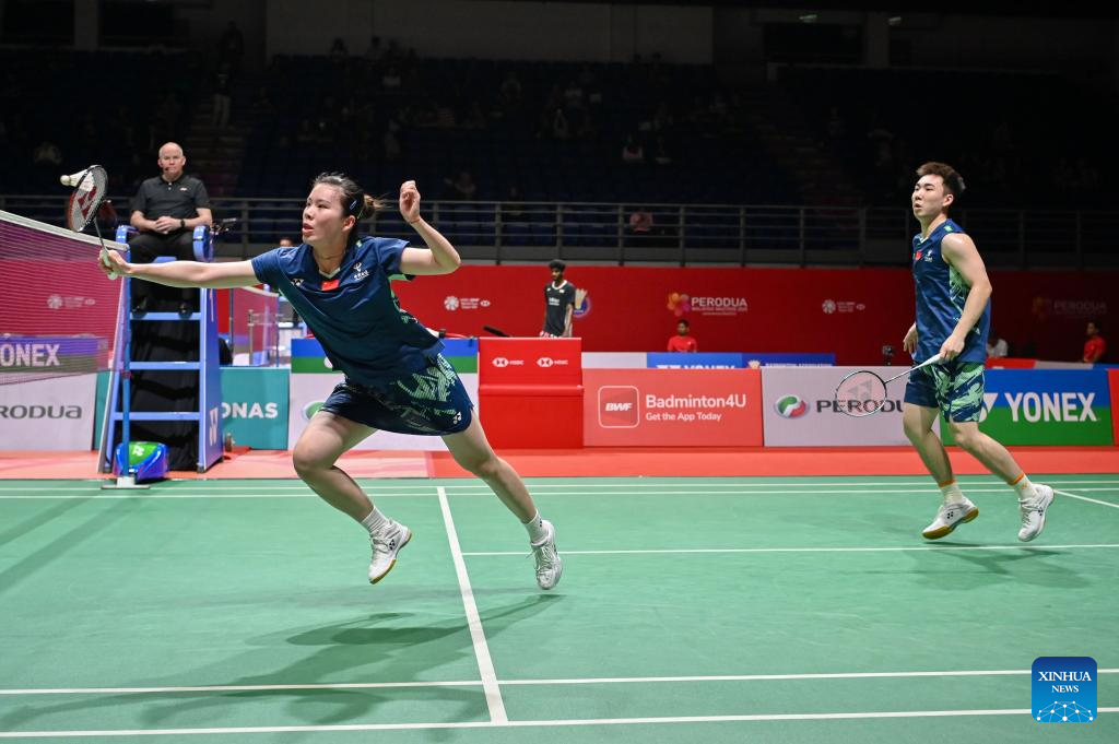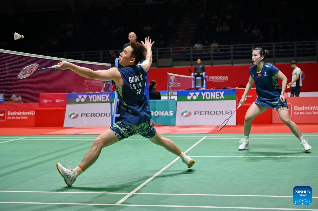 Guo Xinwa/Chen Fanghui (L) of China compete during the mixed doubles round of 16 match against Dejan Ferdinansyah/Siti Fadia Silva Ramadhanti of Indonesia at 2025 Malaysia Masters badminton tournament in Kuala Lumpur, Malaysia, May 22, 2025. (Photo by Chong Voon Chung/Xinhua)