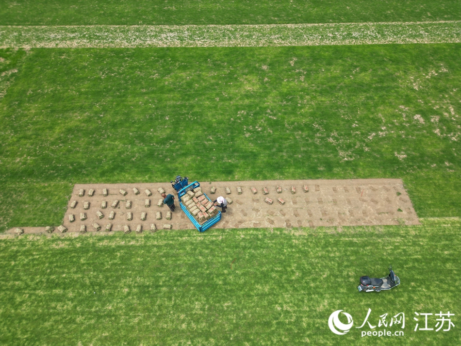 In early summer, the scent of fresh grass hangs in the air at turf planting bases in Qianchang village, Rugao, a county-level city in Nantong, east China's Jiangsu Province. Villagers cut, roll, and load sheets of turf, rapidly stacking them into the trucks.