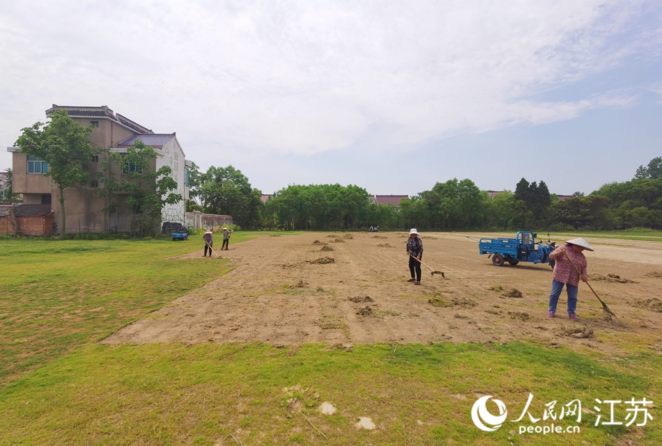 Villagers tend to the farmland after harvesting turfs in Qianchang village, Rugao, a county-level city in Nantong, east China's Jiangsu Province. (People's Daily Online/Wang Jiliang)