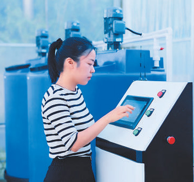 Wang Yuanyuan operates an Internet of Things (IoT) system in a greenhouse in Dingzhai village, Dingzhai township, Shangyu district, Shaoxing city, east China's Zhejiang Province. (People's Daily Online/Dou Hanyang)