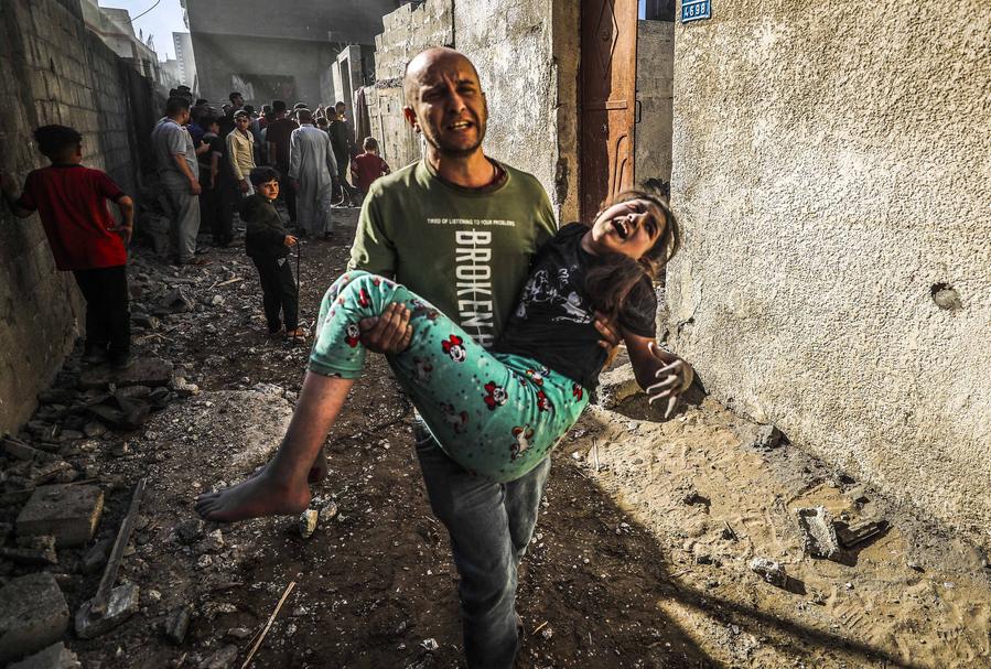 A man holds an injured girl for help after an Israeli airstrike in the Jabalia refugee camp, northern Gaza Strip, May 21, 2025. (Photo by Mahmoud Zaki/Xinhua)