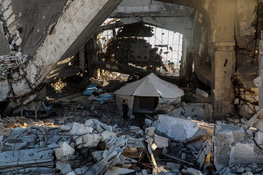 A displaced boy stands by a tent among the rubble of a destroyed building in the seaport area of western Gaza City, on May 21, 2025. (Photo by Rizek Abdeljawad/Xinhua)