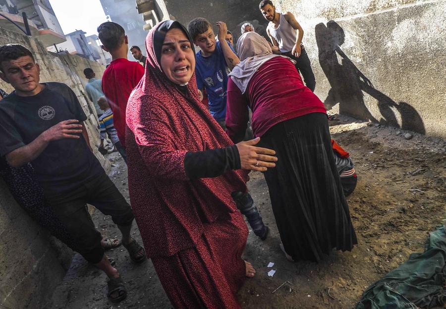 Palestinians react after an Israeli airstrike in the Jabalia refugee camp, northern Gaza Strip, May 21, 2025. (Photo by Mahmoud Zaki/Xinhua)