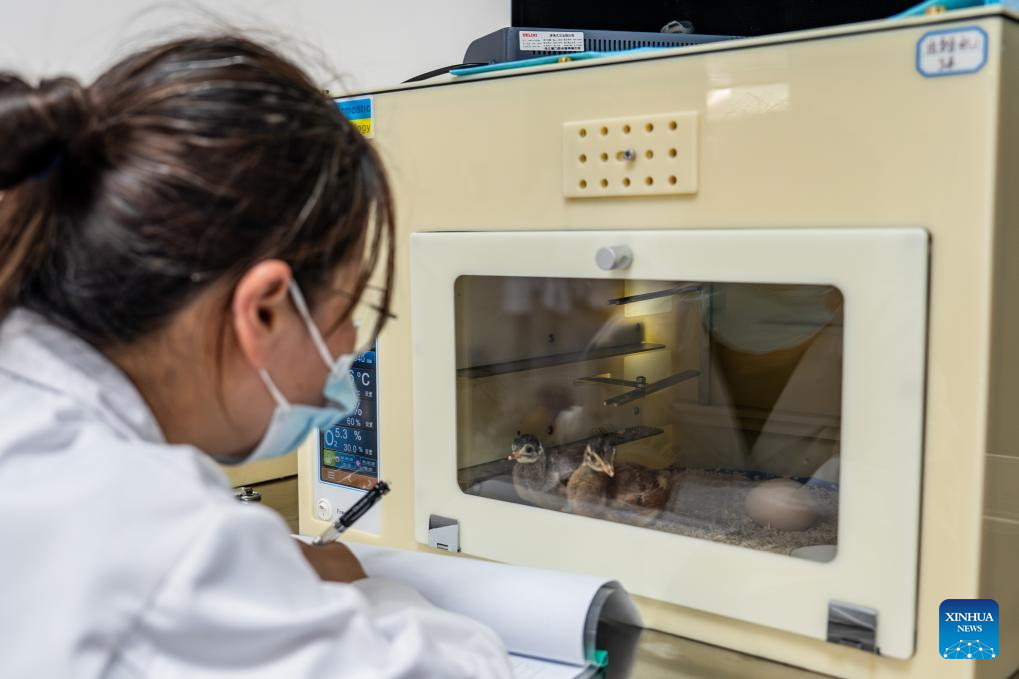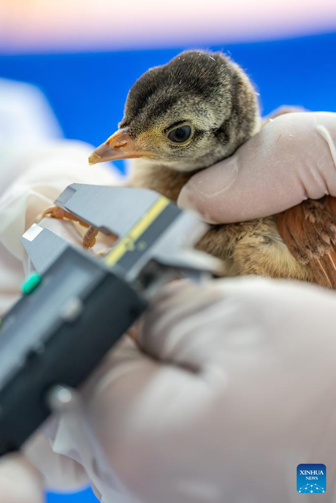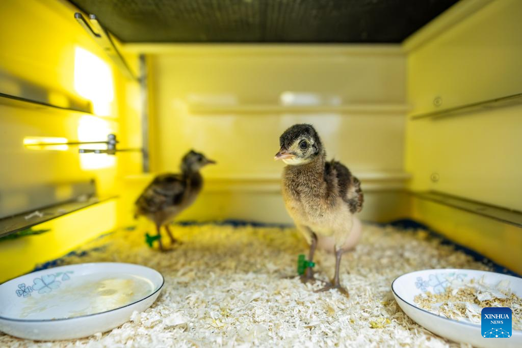 A staff member of Yunnan Forest Nature Center checks the condition of green peafowl chicks in Kunming, southwest China's Yunnan Province, May 19, 2025. (Xinhua/Hu Chao)