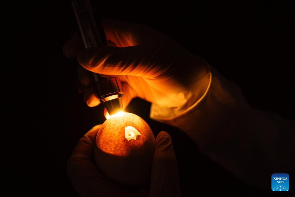 A staff member of Yunnan Forest Nature Center checks the condition of a green peafowl chick, who is about to break out of the shell, in Kunming, southwest China's Yunnan Province, May 19, 2025. (Xinhua/Hu Chao)