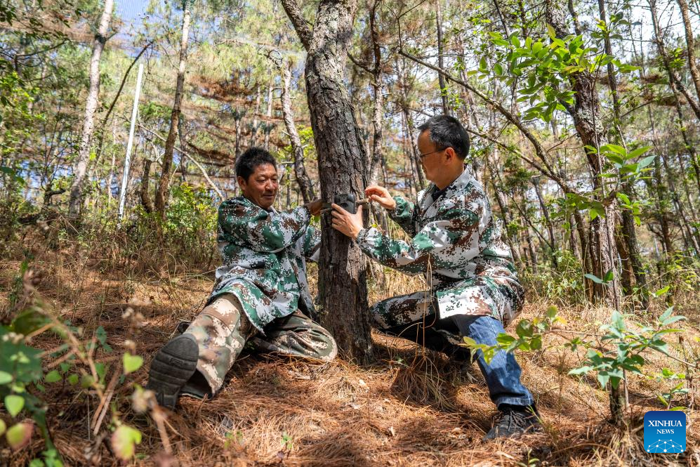 Staff members set an infrared camera at the Weishan Qinghua green peafowl provincial nature reserve in the Bai Autonomous Prefecture of Dali, southwest China's Yunnan Province, May 20, 2025. (Xinhua/Hu Chao)