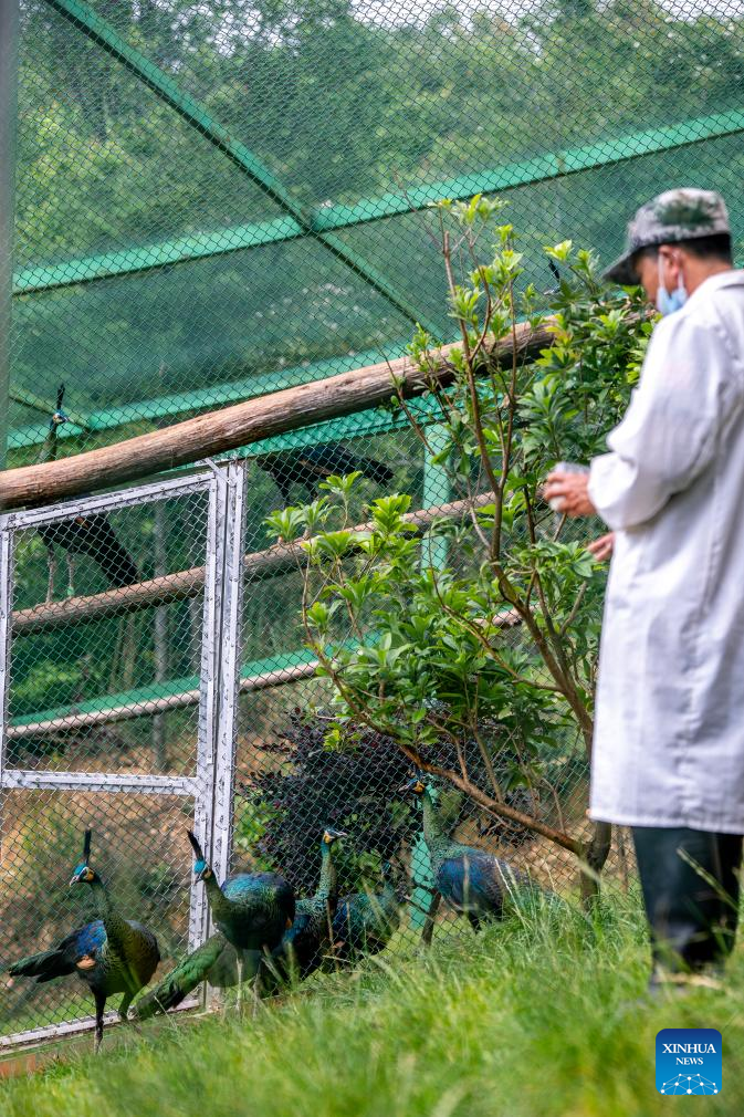Staff members feed green peafowls with a drawer-shaped trough at the Weishan Qinghua green peafowl provincial nature reserve in the Bai Autonomous Prefecture of Dali, southwest China's Yunnan Province, May 20, 2025. (Xinhua/Hu Chao)