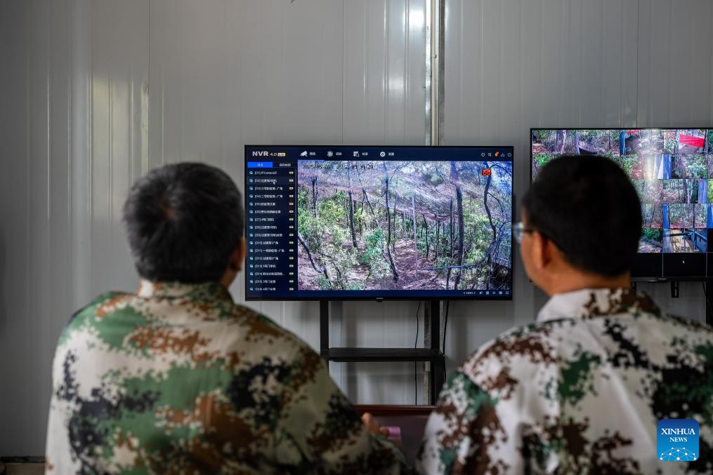 Staff members check the condition of green peafowls released into the wild via a monitoring system at the Weishan Qinghua green peafowl provincial nature reserve in the Bai Autonomous Prefecture of Dali, southwest China's Yunnan Province, May 20, 2025. (Xinhua/Zhao Peiran)