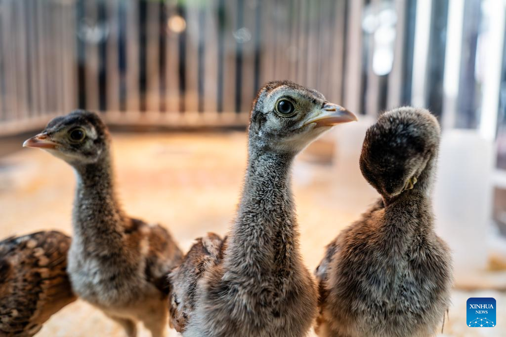 Green peafowl chicks are seen at the Yunnan Forest Nature Center in Kunming, southwest China's Yunnan Province, May 19, 2025. (Xinhua/Hu Chao)