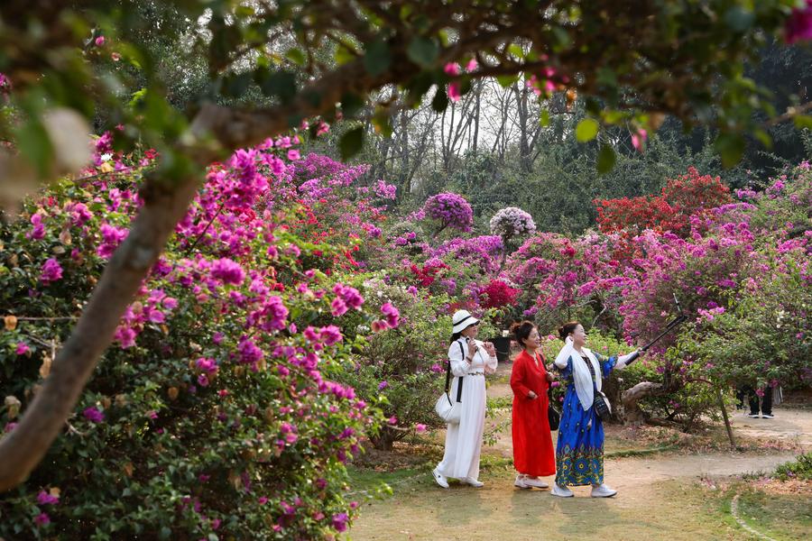Tourists take selfies at the tropical flowers and plants garden in Xishuangbanna, southwest China's Yunnan Province, March 16, 2025. (Photo by Li Yunsheng/Xinhua)