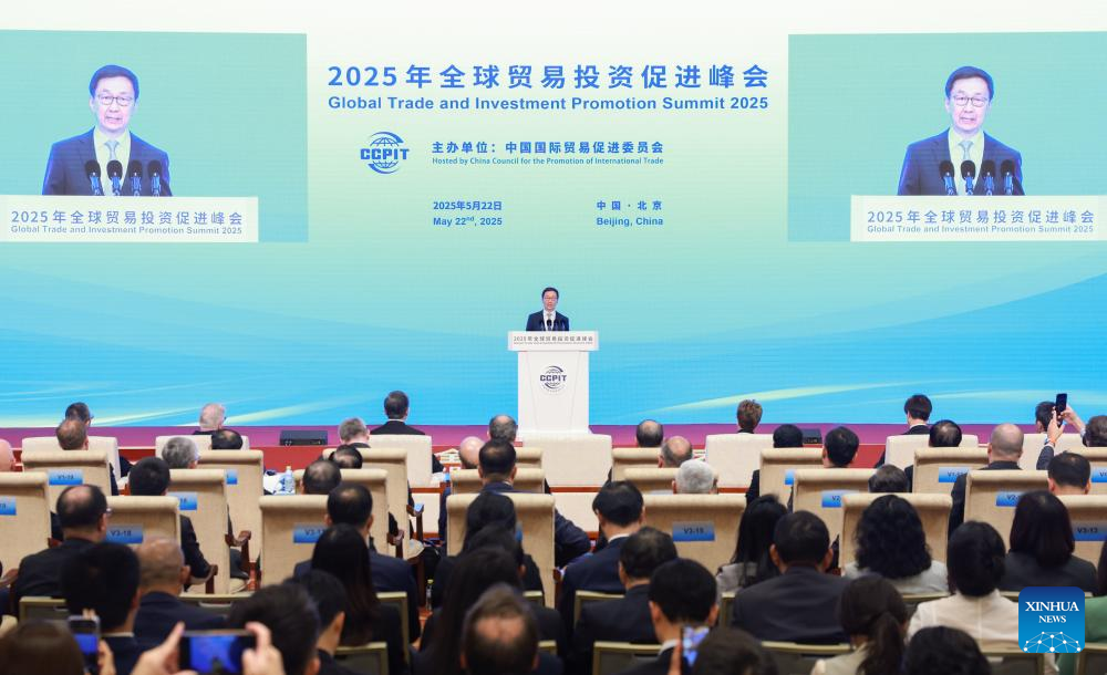 Chinese Vice President Han Zheng addresses the opening ceremony of the Global Trade and Investment Promotion Summit 2025 in Beijing, capital of China, May 22, 2025. (Xinhua/Wang Ye)