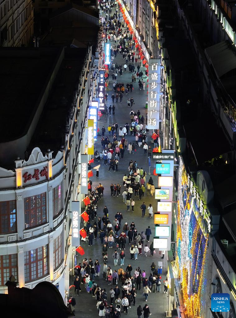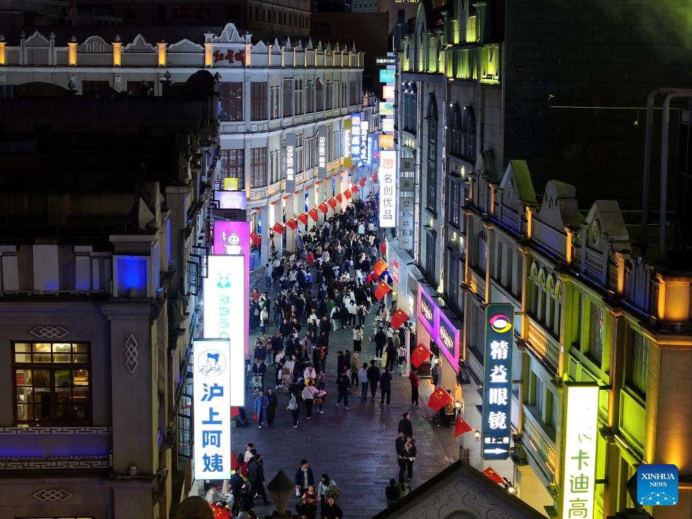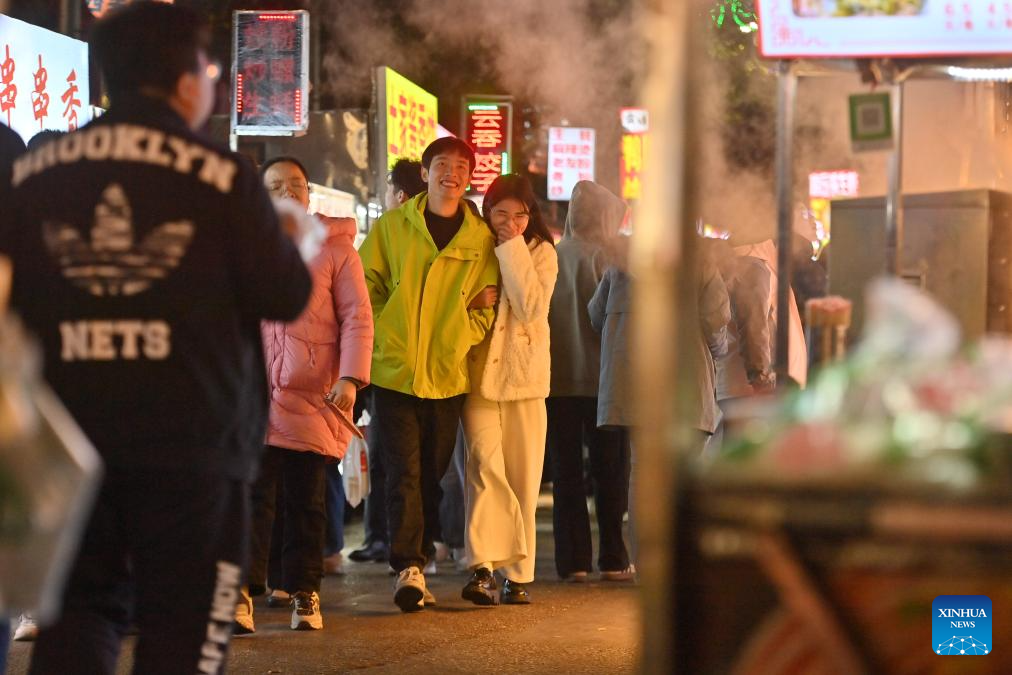 People wander at a commercial strip in Nanning, south China's Guangxi Zhuang Autonomous Region, March 31, 2025. Nighttime economy refers to business activities between 6 p.m. and 6 a.m. In recent years, Nanning has been continuously focusing on the upgrade of consumption experience and promoting the integration of cultural tourism and commerce. Various night fairs and booths across the city have boosted consumption and injected vitality into the city's night economy. (Xinhua/Huang Xiaobang)