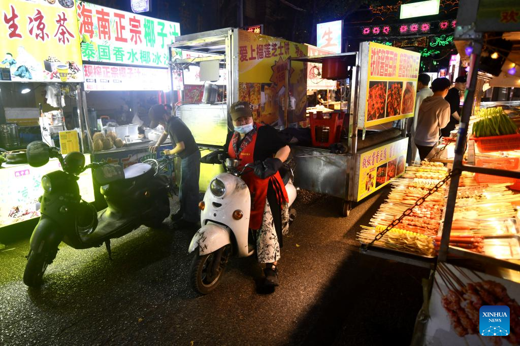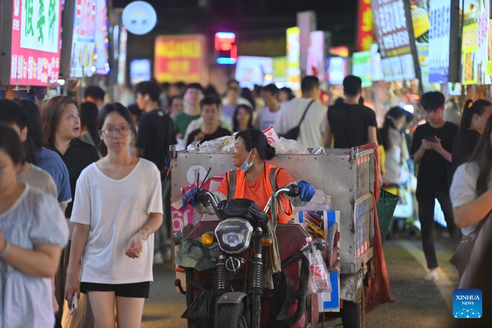 A sanitation worker is seen at the Xiguan night market in Nanning, south China's Guangxi Zhuang Autonomous Region, May 20, 2025. Nighttime economy refers to business activities between 6 p.m. and 6 a.m. In recent years, Nanning has been continuously focusing on the upgrade of consumption experience and promoting the integration of cultural tourism and commerce. Various night fairs and booths across the city have boosted consumption and injected vitality into the city's night economy. (Xinhua/Huang Xiaobang)