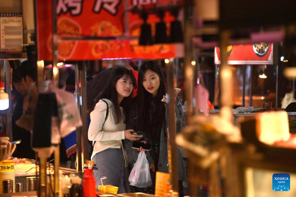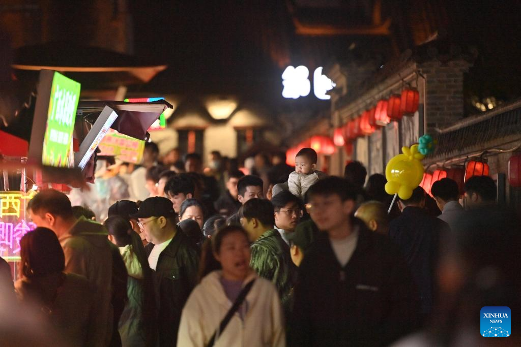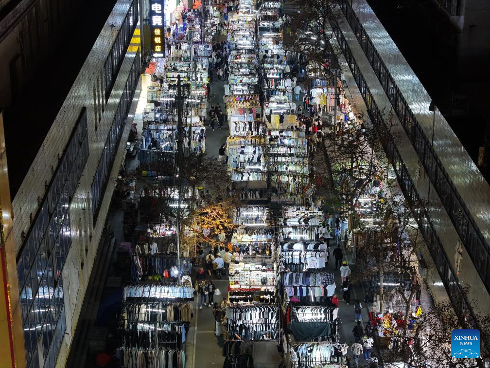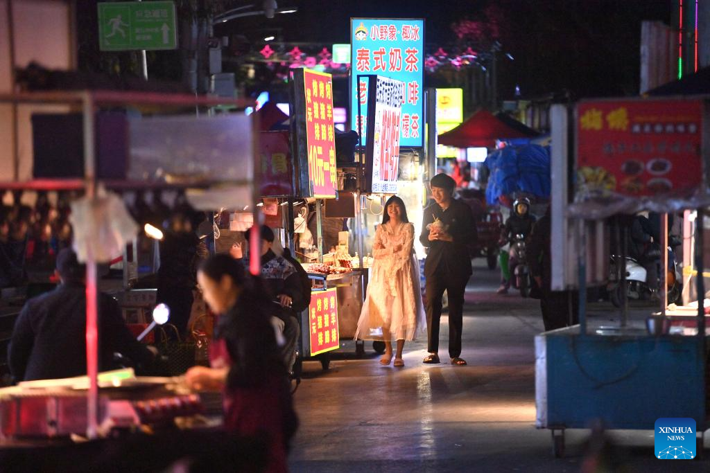 People wander at the Xiguan night market in Nanning, south China's Guangxi Zhuang Autonomous Region, March 29, 2025. Nighttime economy refers to business activities between 6 p.m. and 6 a.m. In recent years, Nanning has been continuously focusing on the upgrade of consumption experience and promoting the integration of cultural tourism and commerce. Various night fairs and booths across the city have boosted consumption and injected vitality into the city's night economy. (Xinhua/Huang Xiaobang)