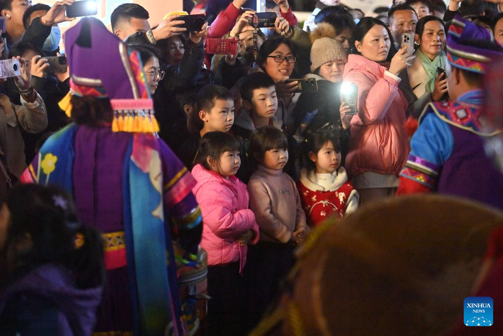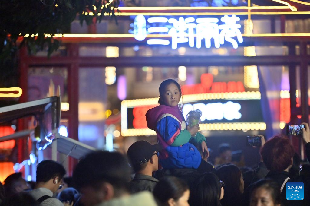 People watch folk performance at a commercial strip in Nanning, south China's Guangxi Zhuang Autonomous Region, March 31, 2025. Nighttime economy refers to business activities between 6 p.m. and 6 a.m. In recent years, Nanning has been continuously focusing on the upgrade of consumption experience and promoting the integration of cultural tourism and commerce. Various night fairs and booths across the city have boosted consumption and injected vitality into the city's night economy. (Xinhua/Huang Xiaobang)