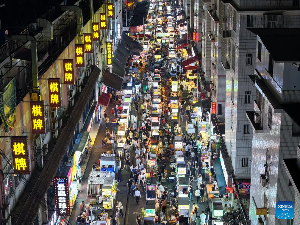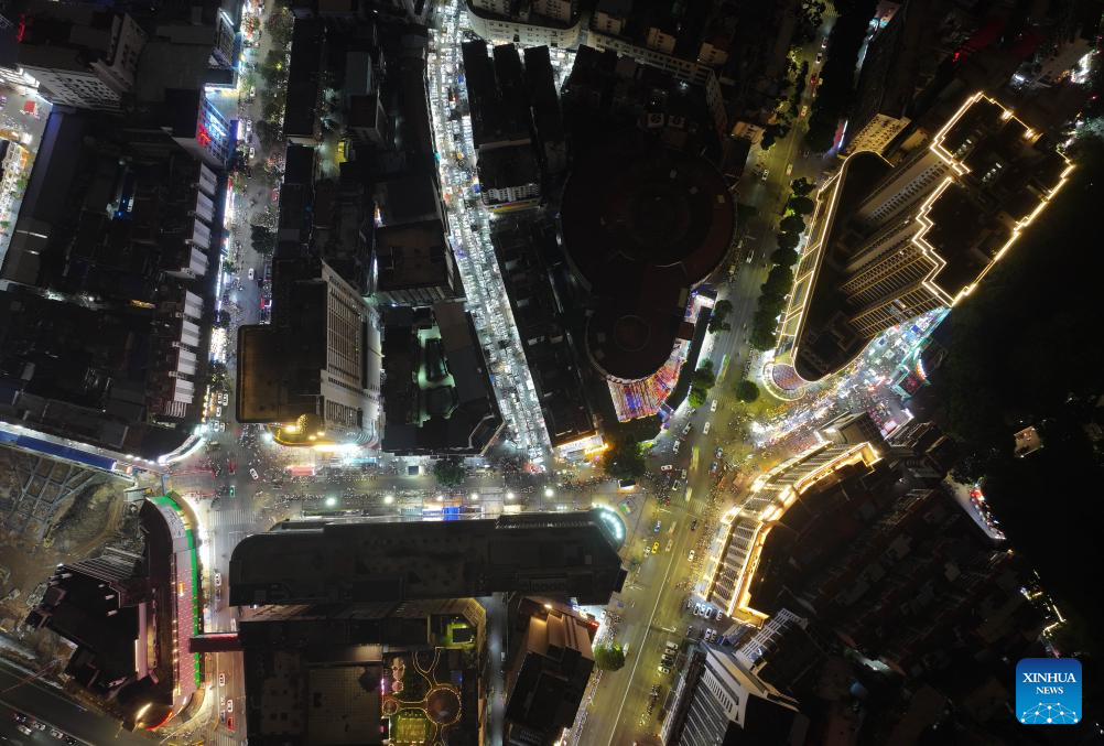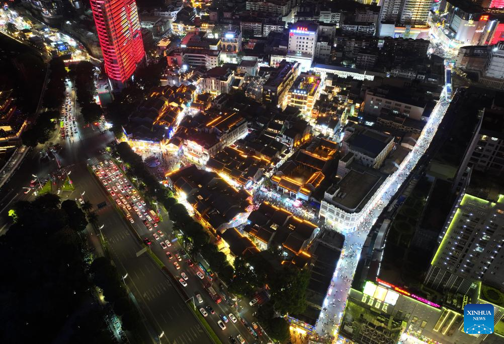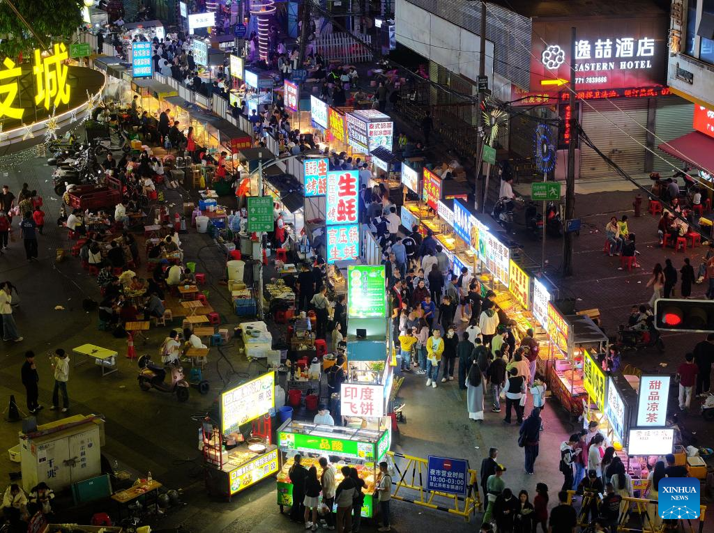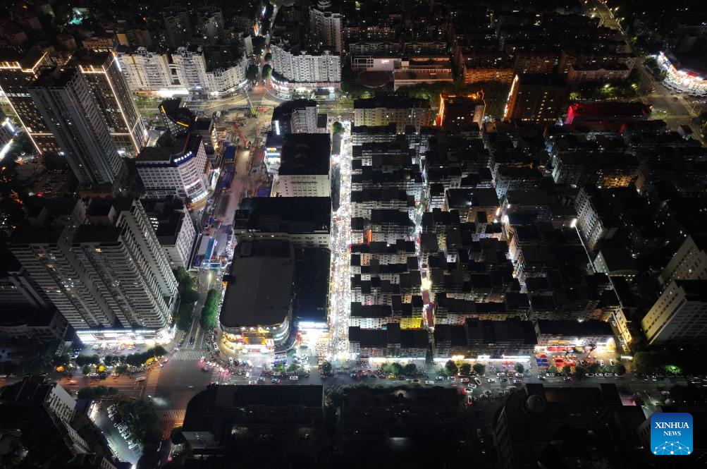 An aerial drone photo taken on May 20, 2025 shows the Xiguan night market in Nanning, south China's Guangxi Zhuang Autonomous Region. Nighttime economy refers to business activities between 6 p.m. and 6 a.m. In recent years, Nanning has been continuously focusing on the upgrade of consumption experience and promoting the integration of cultural tourism and commerce. Various night fairs and booths across the city have boosted consumption and injected vitality into the city's night economy. (Xinhua/Huang Xiaobang)