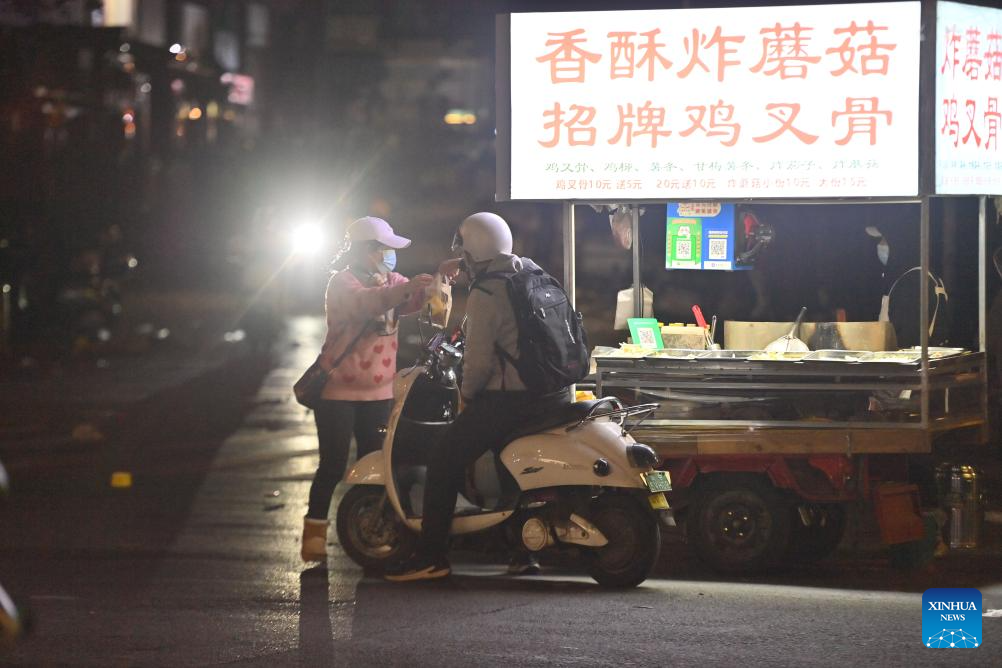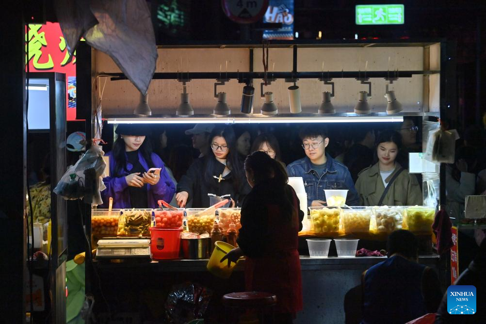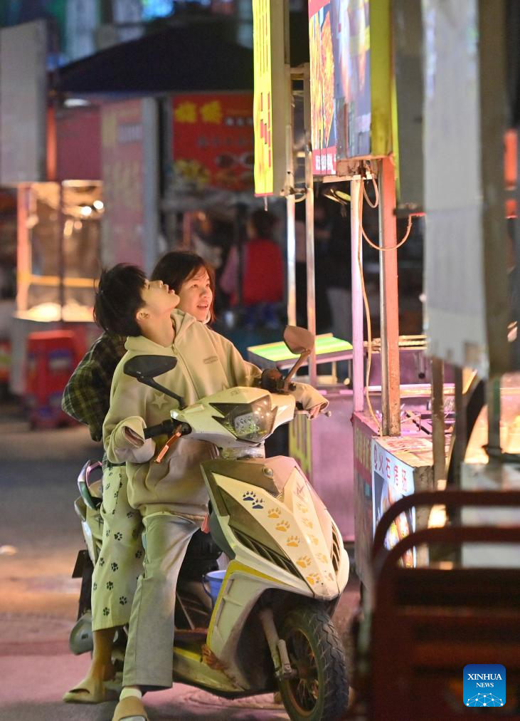 People buy snacks at the Xiguan night market in Nanning, south China's Guangxi Zhuang Autonomous Region, March 30, 2025. Nighttime economy refers to business activities between 6 p.m. and 6 a.m. In recent years, Nanning has been continuously focusing on the upgrade of consumption experience and promoting the integration of cultural tourism and commerce. Various night fairs and booths across the city have boosted consumption and injected vitality into the city's night economy. (Xinhua/Huang Xiaobang)