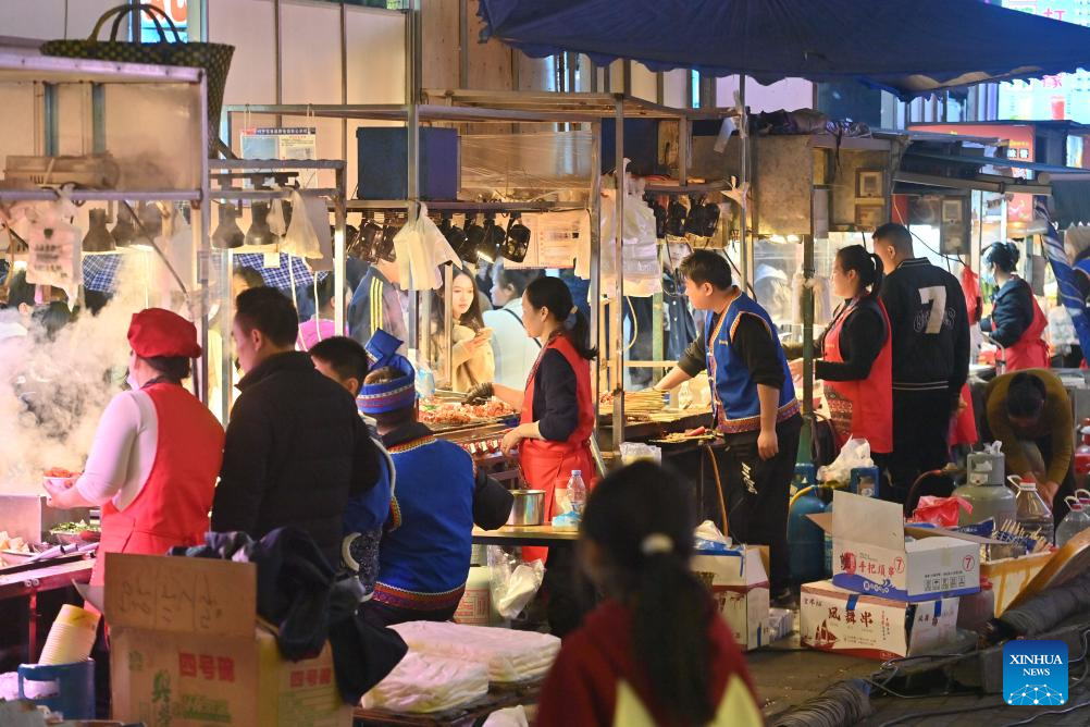 Vendors prepare food at the Xiguan night market in Nanning, south China's Guangxi Zhuang Autonomous Region, March 29, 2025. Nighttime economy refers to business activities between 6 p.m. and 6 a.m. In recent years, Nanning has been continuously focusing on the upgrade of consumption experience and promoting the integration of cultural tourism and commerce. Various night fairs and booths across the city have boosted consumption and injected vitality into the city's night economy. (Xinhua/Huang Xiaobang)
