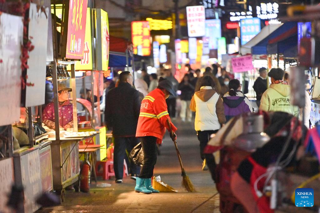 A sanitation worker cleans the road at the Xiguan night market in Nanning, south China's Guangxi Zhuang Autonomous Region, March 30, 2025. Nighttime economy refers to business activities between 6 p.m. and 6 a.m. In recent years, Nanning has been continuously focusing on the upgrade of consumption experience and promoting the integration of cultural tourism and commerce. Various night fairs and booths across the city have boosted consumption and injected vitality into the city's night economy. (Xinhua/Huang Xiaobang)