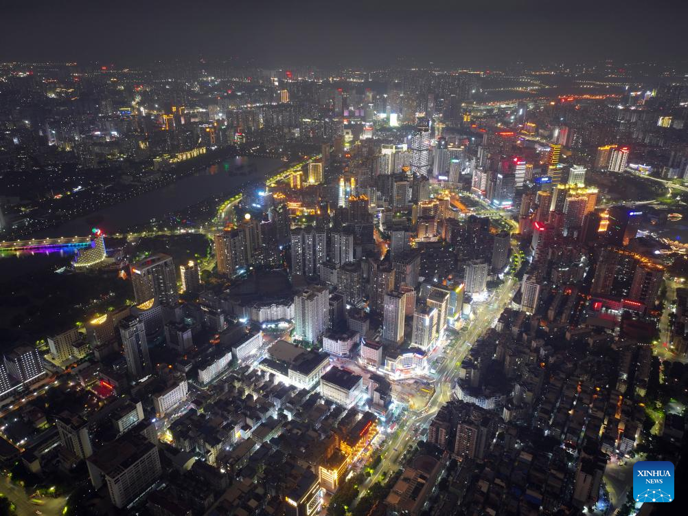An aerial drone photo taken on April 5, 2025 shows the Xiguan night market and its surroundings in Nanning, south China's Guangxi Zhuang Autonomous Region. Nighttime economy refers to business activities between 6 p.m. and 6 a.m. In recent years, Nanning has been continuously focusing on the upgrade of consumption experience and promoting the integration of cultural tourism and commerce. Various night fairs and booths across the city have boosted consumption and injected vitality into the city's night economy. (Xinhua/Huang Xiaobang)