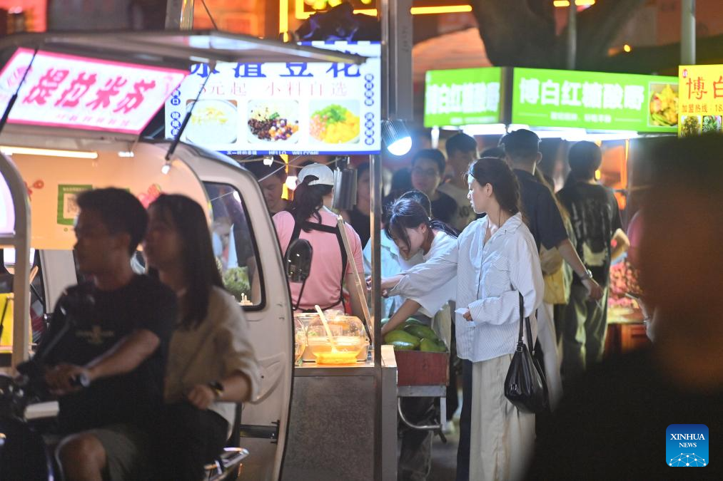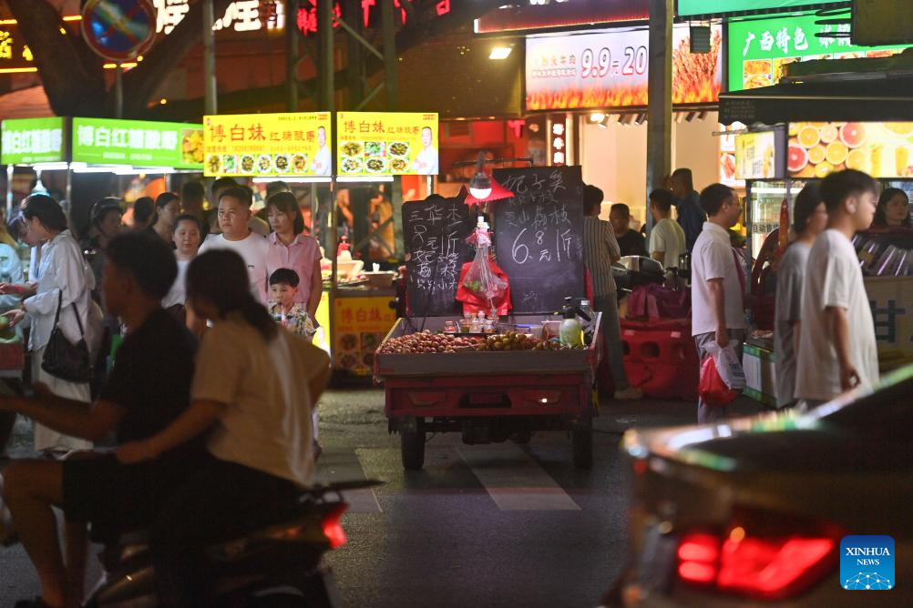 People buy snacks at the Xiguan night market in Nanning, south China's Guangxi Zhuang Autonomous Region, May 20, 2025. Nighttime economy refers to business activities between 6 p.m. and 6 a.m. In recent years, Nanning has been continuously focusing on the upgrade of consumption experience and promoting the integration of cultural tourism and commerce. Various night fairs and booths across the city have boosted consumption and injected vitality into the city's night economy. (Xinhua/Huang Xiaobang)