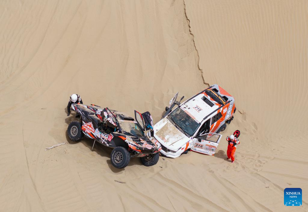 A drone photo shows two racing cars stuck in the desert during stage 2 of the 2025 Taklimakan Rally in Alaer, northwest China's Xinjiang Uygur Autonomous Region, May 22, 2025. (Xinhua/Hu Xingyu)