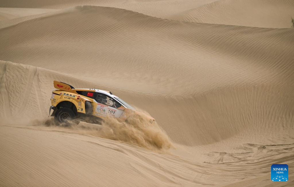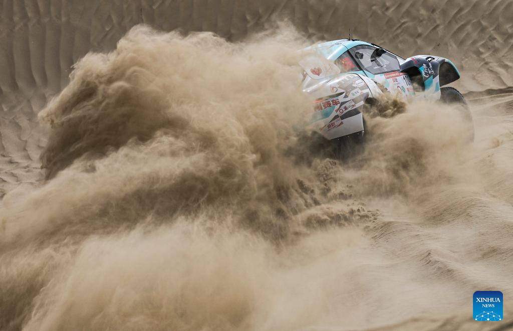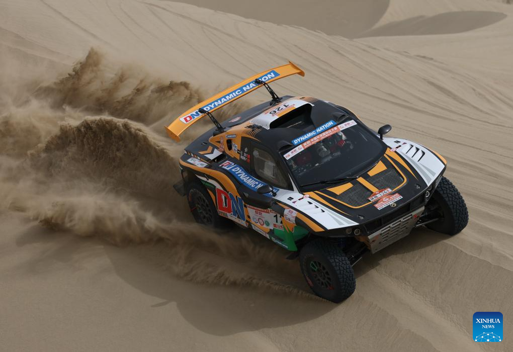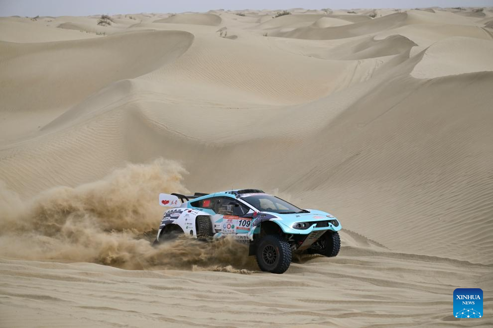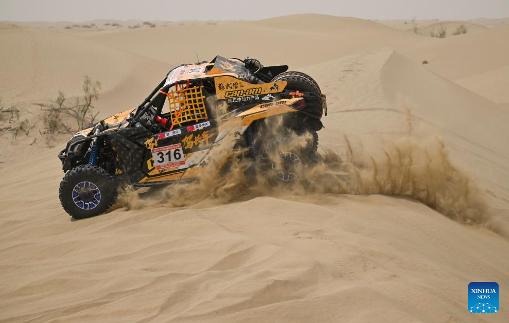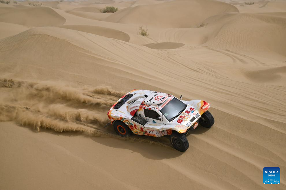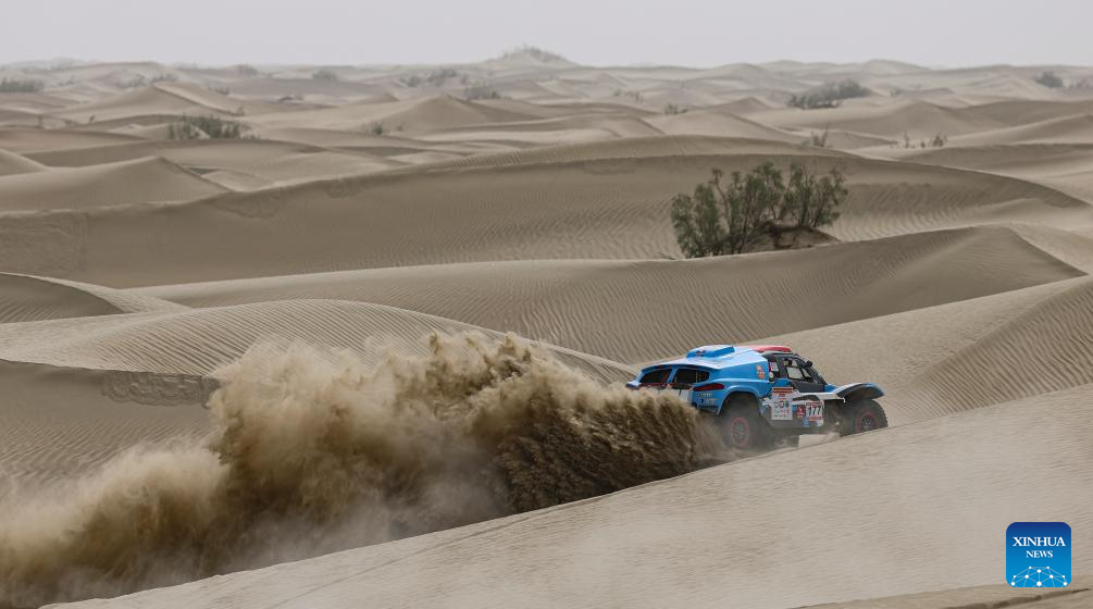 Driver Zhang Ming and co-driver Qin Xu compete during stage 2 of the 2025 Taklimakan Rally in Alaer, northwest China's Xinjiang Uygur Autonomous Region, May 22, 2025. (Xinhua/Hu Huhu)