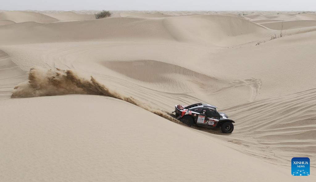 Rider Zhang Yuyang competes during stage 2 of the 2025 Taklimakan Rally in Alaer, northwest China's Xinjiang Uygur Autonomous Region, May 22, 2025. (Xinhua/Hu Huhu)