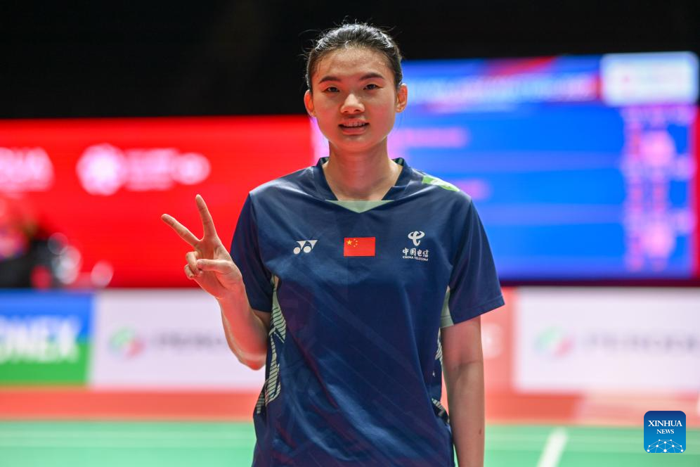 Han Yue of China poses for a photo after the women's singles quarterfinal against Putri Kusuma Wardani of Indonesia at the Malaysia Masters 2025 badminton tournament in Kuala Lumpur, Malaysia, May 23, 2025. (Photo by Chong Voon Chung/Xinhua)