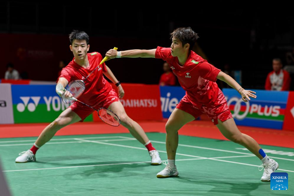 Feng Yanzhe/Huang Dongping (L) of China compete during the mixed doubles quarterfinal against Dechapol Puavaranukroh/Supissara Paewsampran of Thailand at 2025 Malaysia Masters badminton tournament in Kuala Lumpur, Malaysia, May 23, 2025. (Photo by Chong Voon Chung/Xinhua)