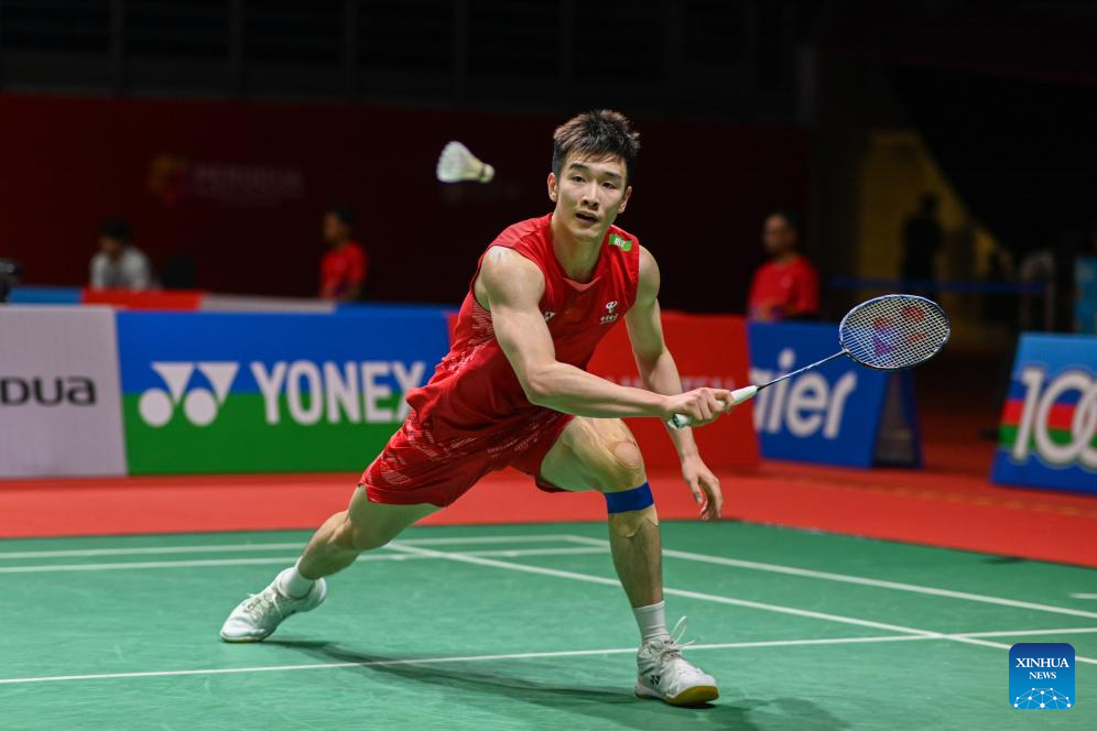 Ng Ka Long Angus of China's Hong Kong hits a return during the men's singles quarterfinal against Li Shifeng of China at 2025 Malaysia Masters badminton tournament in Kuala Lumpur, Malaysia, May 23, 2025. (Photo by Chong Voon Chung/Xinhua)