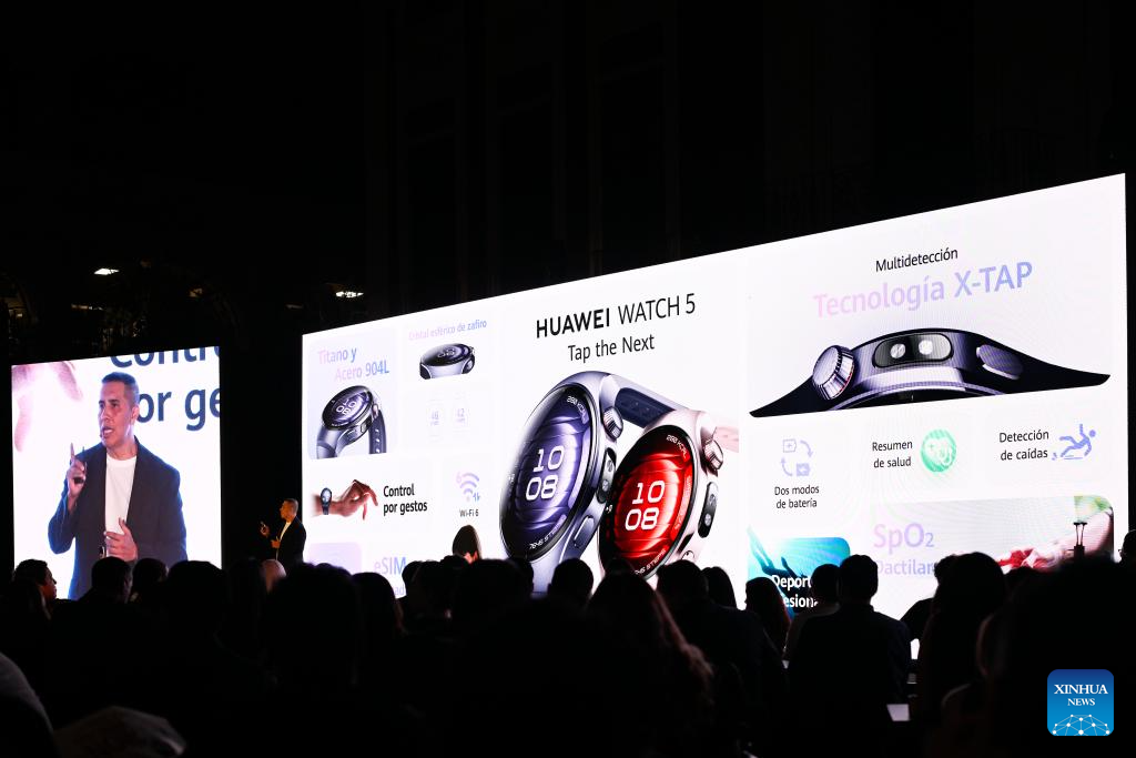 This photo shows newly-released Huawei Watch 5 during a product launch event of Huawei in Mexico City, Mexico, May 21, 2025. Chinese tech giant Huawei on Wednesday launched its new line of products under the "Fashion Next" concept in Mexico's capital.