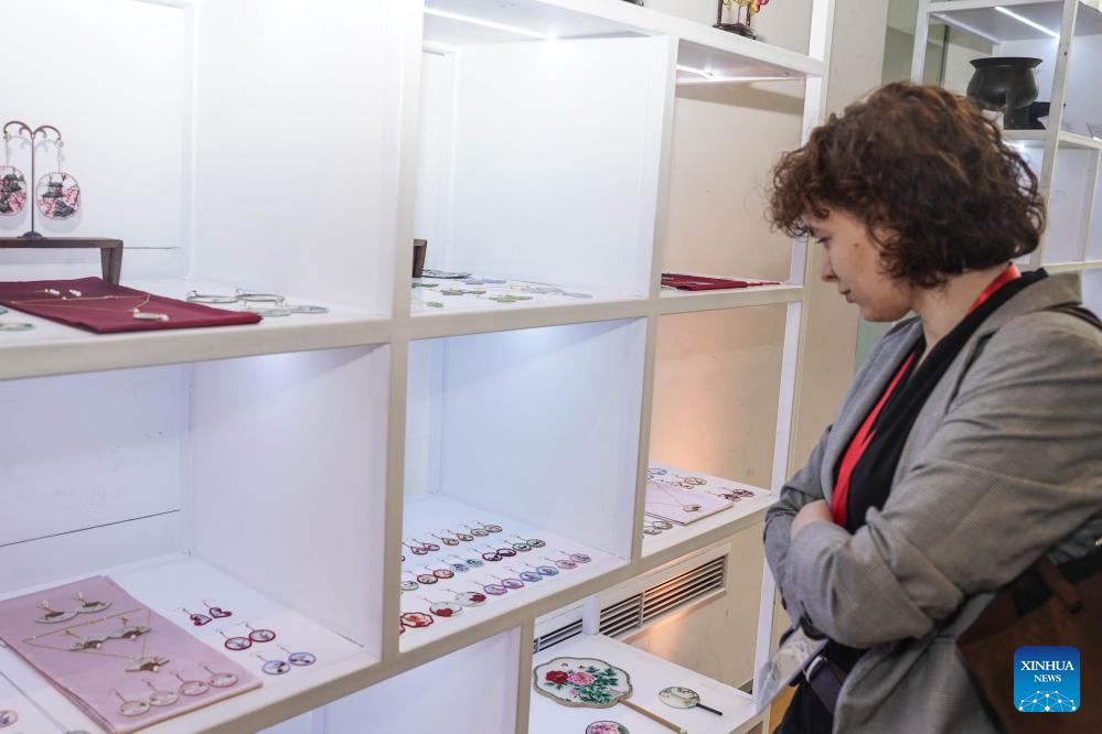 A visitor looks at Chinese cultural and creative products during the 2025 Budapest China Tourism and Culture Week in Budapest, Hungary, May 23, 2025. The 2025 Budapest China Tourism and Culture Week started on Friday in the Hungarian capital, aiming to facilitate exchanges and mutual learning between Chinese and other civilizations through cooperation platforms built for cultural and tourism industry insiders.
