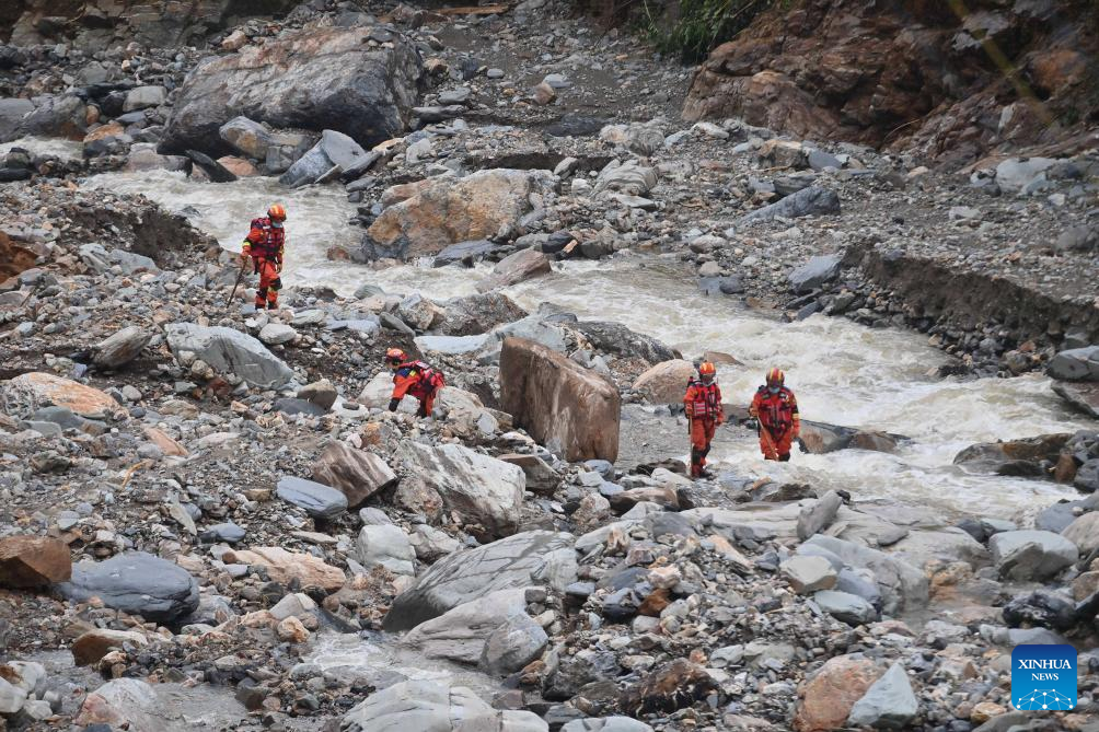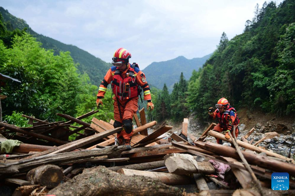 Rescuers work at the site of a mountain torrent and mudslide in Longsheng County in south China's Guangxi Zhuang Autonomous Region, May 23, 2025. Three people have been confirmed dead and five remain missing after a mountain torrent and mudslide struck a village in south China's Guangxi Zhuang Autonomous Region early Friday morning, local authorities said.