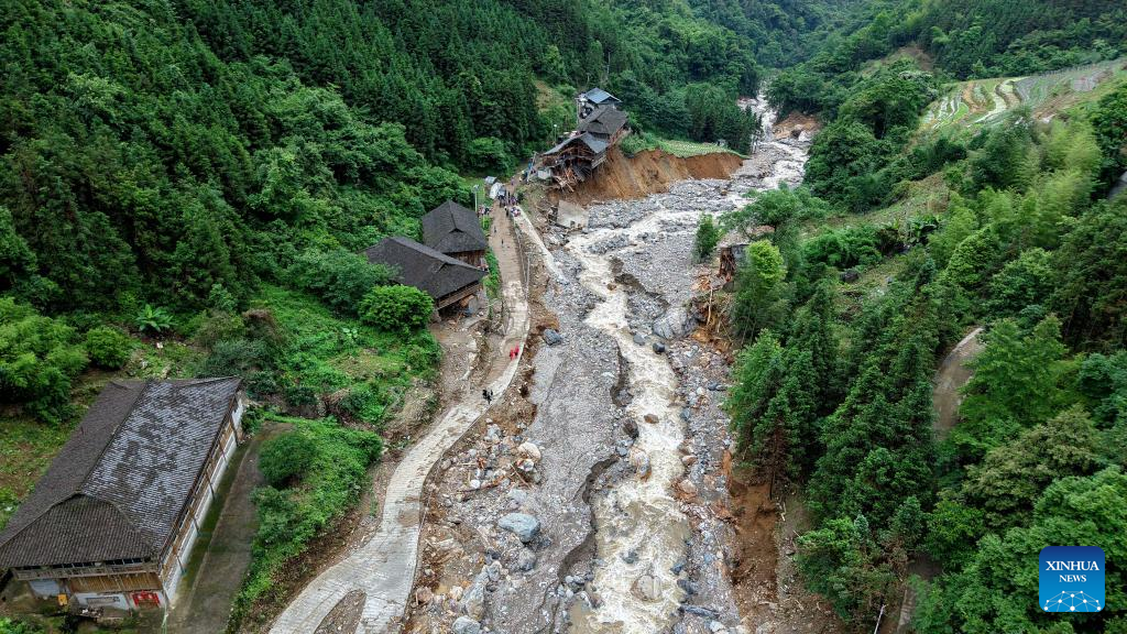 An aerial drone photo shows the site of a mountain torrent and mudslide in Longsheng County in south China's Guangxi Zhuang Autonomous Region, May 23, 2025. Three people have been confirmed dead and five remain missing after a mountain torrent and mudslide struck a village in south China's Guangxi Zhuang Autonomous Region early Friday morning, local authorities said. Rescue efforts, which started immediately after the incident hit the village of Sanshe in Longsheng County, Guilin City, are underway, with more than 300 rescuers involved. (Photo by Pan Zhixiang/Xinhua)