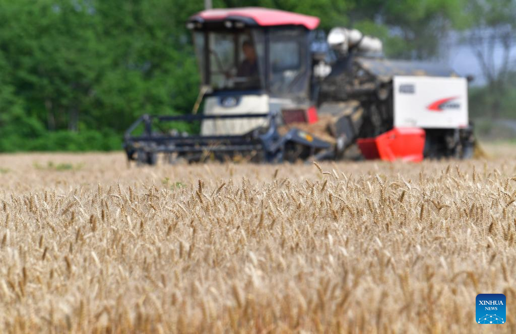 A harvester reaps wheat in the fields in Huishan District of Wuxi, east China's Jiangsu Province, on May 25, 2025. Winter wheat is harvested in succession nationwide, according to the Ministry of Agriculture and Rural Affairs. (Photo by Hai Yueliang/Xinhua)