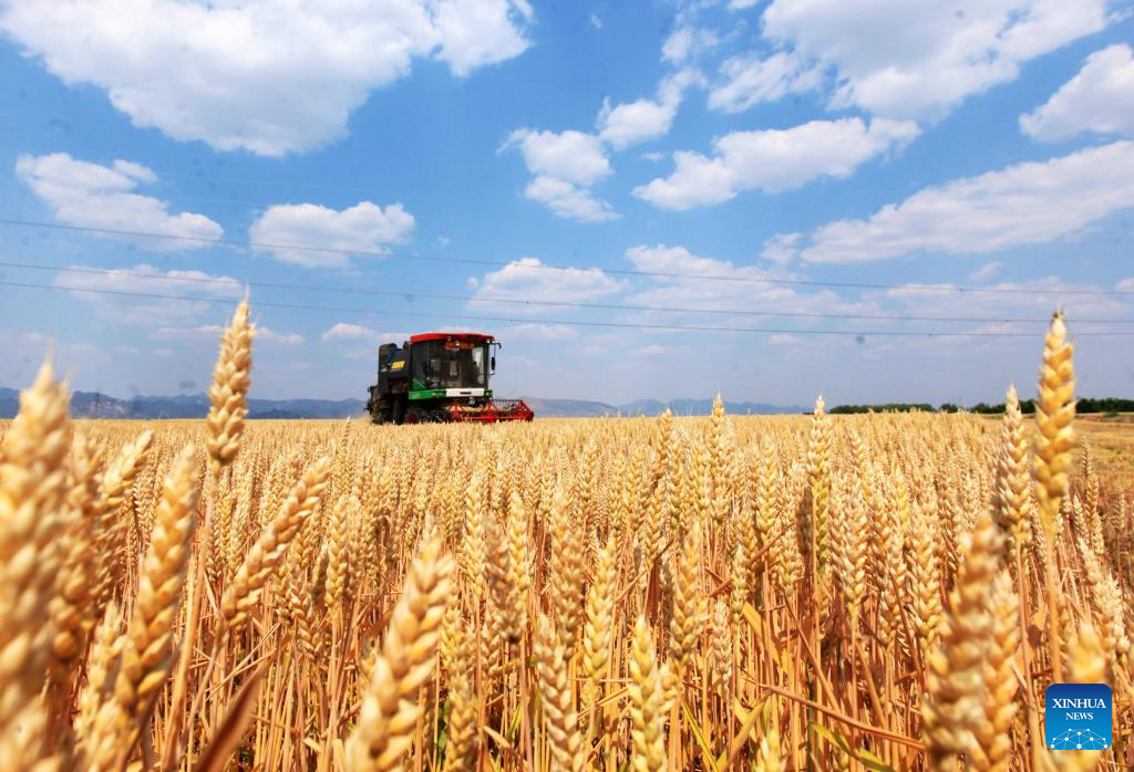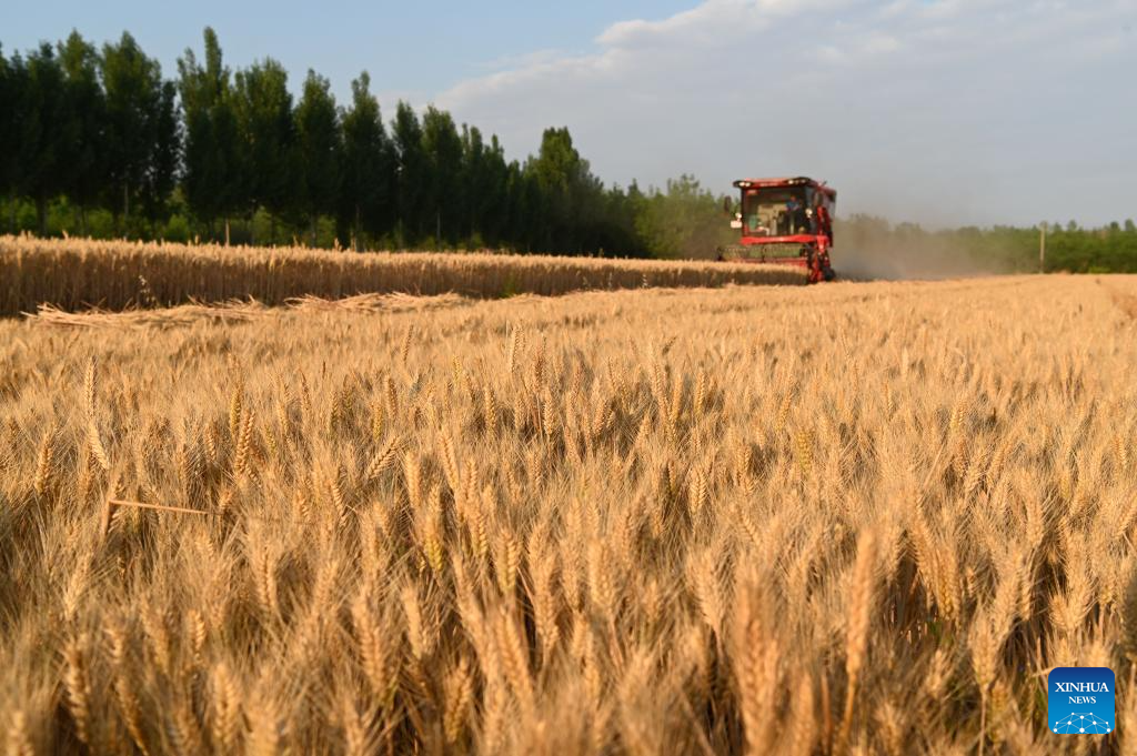 A harvester reaps wheat in the fields in Huzi Village of Qinyang, central China's Henan Province, on May 25, 2025. Winter wheat is harvested in succession nationwide, according to the Ministry of Agriculture and Rural Affairs. (Photo by Yang Fan/Xinhua)