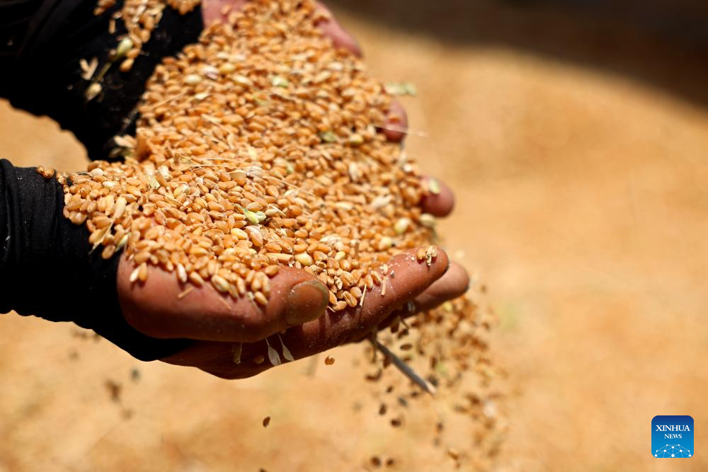 A farmer shows freshly harvested wheat in Shagou Village of Zaozhuang City, east China's Shandong Province, on May 25, 2025. Winter wheat is harvested in succession nationwide, according to the Ministry of Agriculture and Rural Affairs. (Photo by Sun Zhongzhe/Xinhua)