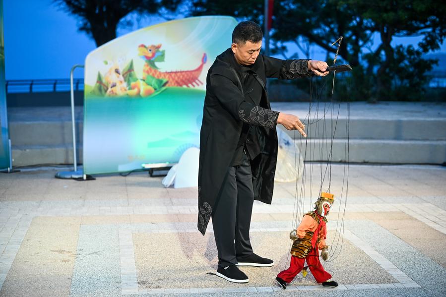 A Chinese artist performs a puppetry show in Zurrieq, Malta, May 24, 2025. A vibrant showcase of Chinese traditional arts, including music, dance, and puppetry, was held Saturday night in Zurrieq, western Malta, to celebrate the upcoming Chinese Dragon Boat Festival. (Photo by Jonathan Borg/Xinhua)