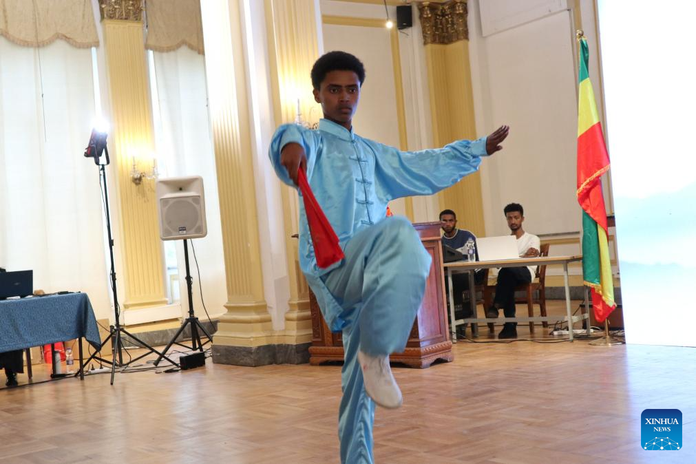 A contestant performs traditional Chinese martial art at the 24th "Chinese Bridge" Chinese Proficiency Competition for Ethiopian college students in Addis Ababa, Ethiopia, May 23, 2025. The 24th "Chinese Bridge" Chinese Proficiency Competition for Ethiopian college students was held Friday in Addis Ababa, Ethiopia's capital, with 14 finalists from universities across the country showcasing their Mandarin skills and cultural knowledge. (Xinhua/Liu Fangqiang)