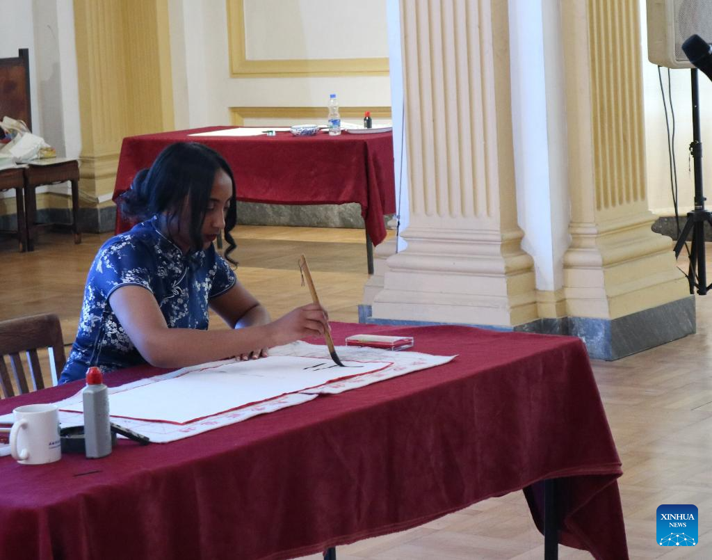 A contestant displays Chinese calligraphy at the 24th "Chinese Bridge" Chinese Proficiency Competition for Ethiopian college students in Addis Ababa, Ethiopia, May 23, 2025. The 24th "Chinese Bridge" Chinese Proficiency Competition for Ethiopian college students was held Friday in Addis Ababa, Ethiopia's capital, with 14 finalists from universities across the country showcasing their Mandarin skills and cultural knowledge. (Xinhua/Liu Fangqiang)