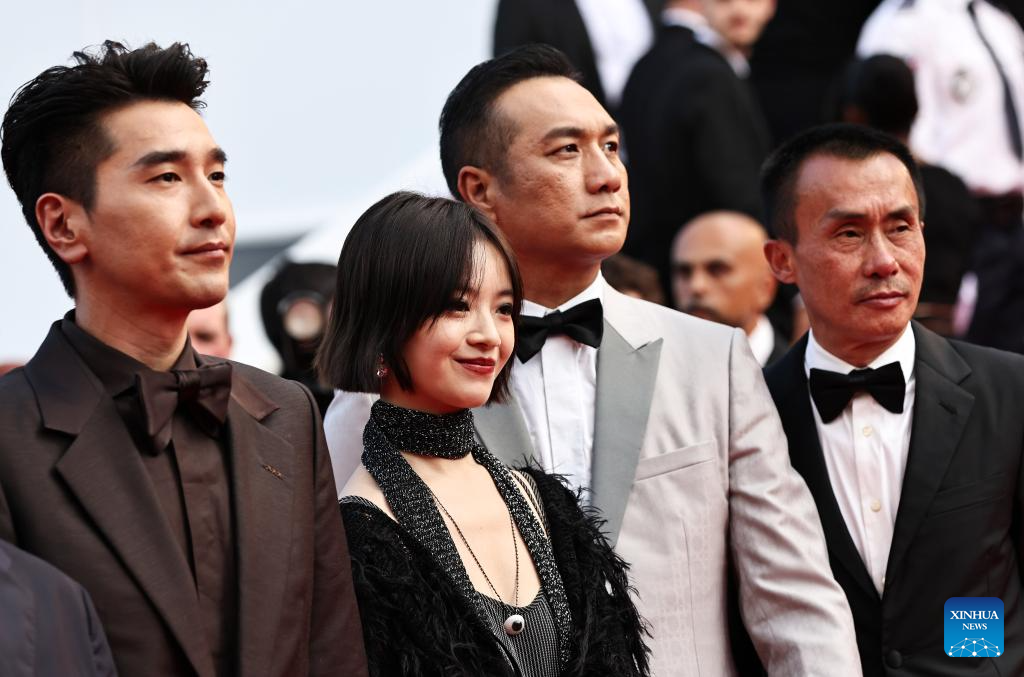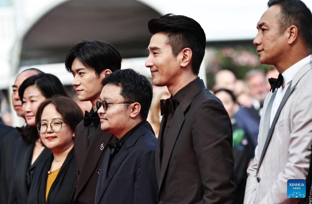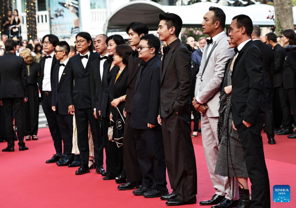Cast members of the Chinese film Resurrection pose upon their arrival at the red carpet of the closing ceremony of the 78th Cannes Film Festival in Cannes, France, May 24, 2025. Chinese director Bi Gan won on Saturday the Special Award at the 78th Cannes Film Festival for his epic fiction feature Resurrection, known in Chinese as Kuang Ye Shi Dai. Festival organizers introduced Resurrection as a work that showcases the continued evolution of Bi's creativity, while staying true to the sensory and poetic qualities that define his unique cinematic style. (Xinhua/Gao Jing)