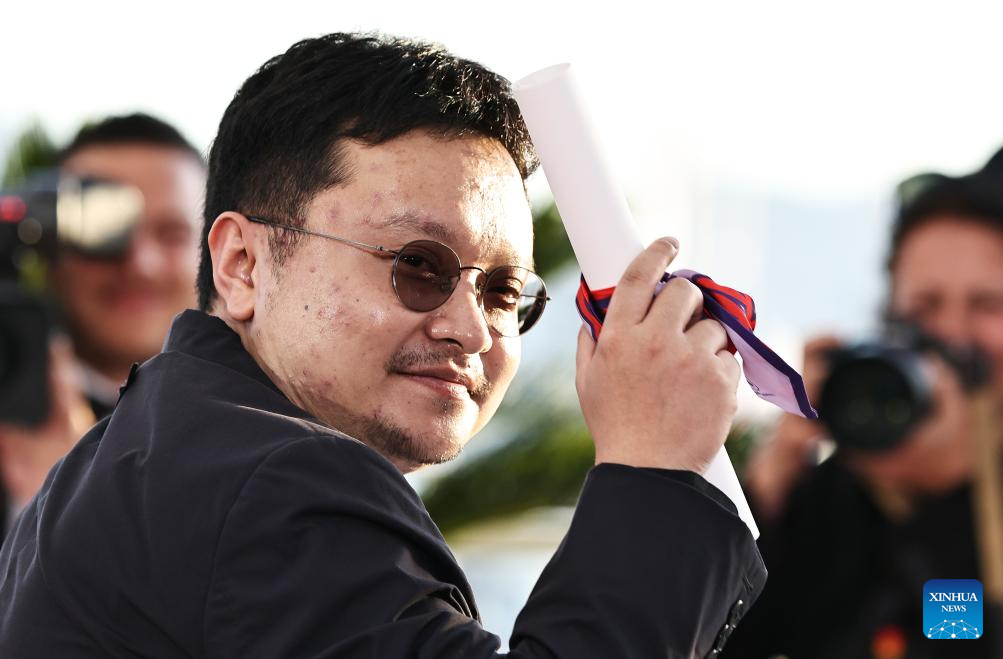 Chinese director Bi Gan poses for a photocall during the closing ceremony of the 78th Cannes Film Festival in Cannes, France, May 24, 2025. Chinese director Bi Gan won on Saturday the Special Award at the 78th Cannes Film Festival for his epic fiction feature Resurrection, known in Chinese as Kuang Ye Shi Dai. Festival organizers introduced Resurrection as a work that showcases the continued evolution of Bi's creativity, while staying true to the sensory and poetic qualities that define his unique cinematic style. (Xinhua/Gao Jing)