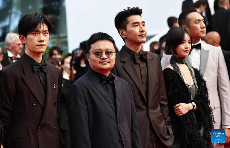 Chinese director Bi Gan (2nd L) and cast members of the Chinese film Resurrection pose upon their arrival at the red carpet of the closing ceremony of the 78th Cannes Film Festival in Cannes, France, May 24, 2025. Chinese director Bi Gan won on Saturday the Special Award at the 78th Cannes Film Festival for his epic fiction feature Resurrection, known in Chinese as Kuang Ye Shi Dai. Festival organizers introduced Resurrection as a work that showcases the continued evolution of Bi's creativity, while staying true to the sensory and poetic qualities that define his unique cinematic style. (Xinhua/Gao Jing)