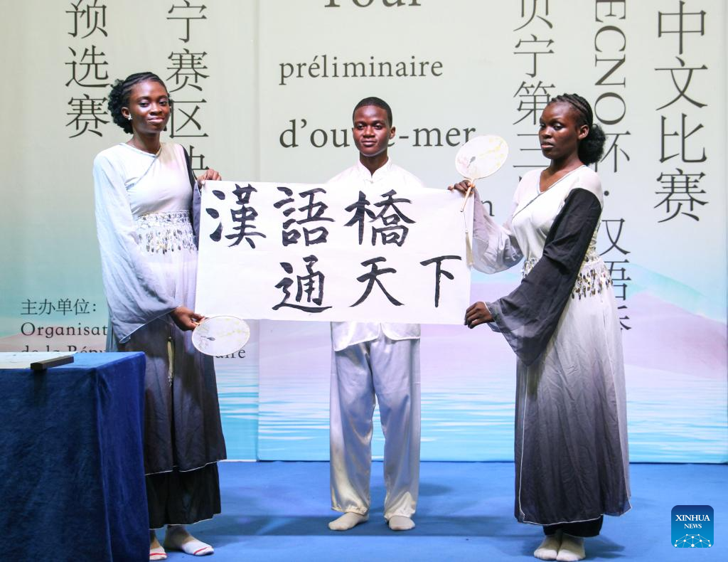 Contestants demonstrate Chinese calligraphy during the 24th "Chinese Bridge" Chinese proficiency competition for Beninese college students at a Chinese cultural center in Cotonou, Benin, May 23, 2025. (Photo by Seraphin Zounyekpe/Xinhua)
