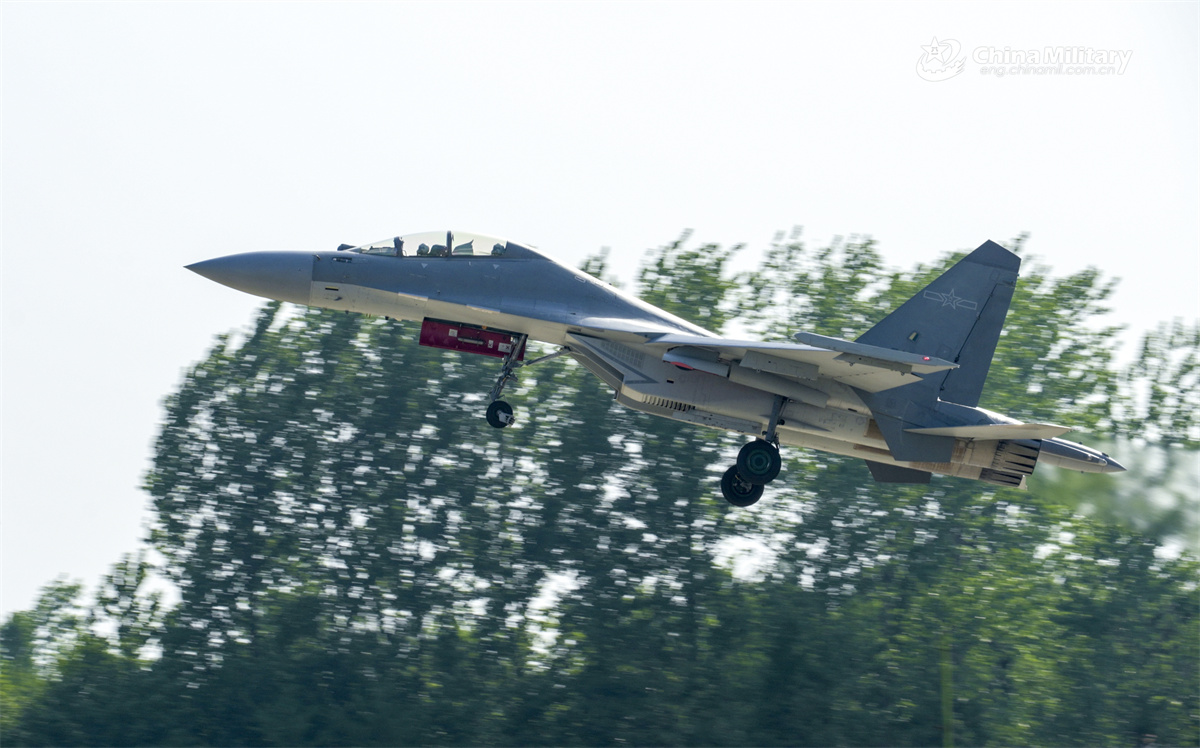 A J-16 multi-role fighter jet attached to an aviation brigade with the air force under the Chinese PLA Eastern Theater Command takes off for a flight training exercise in mid-April, 2025. (eng.chinamil.com.cn/Photo by Zhu Yunlong)