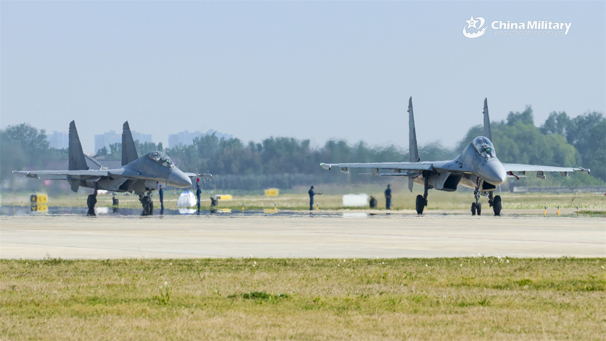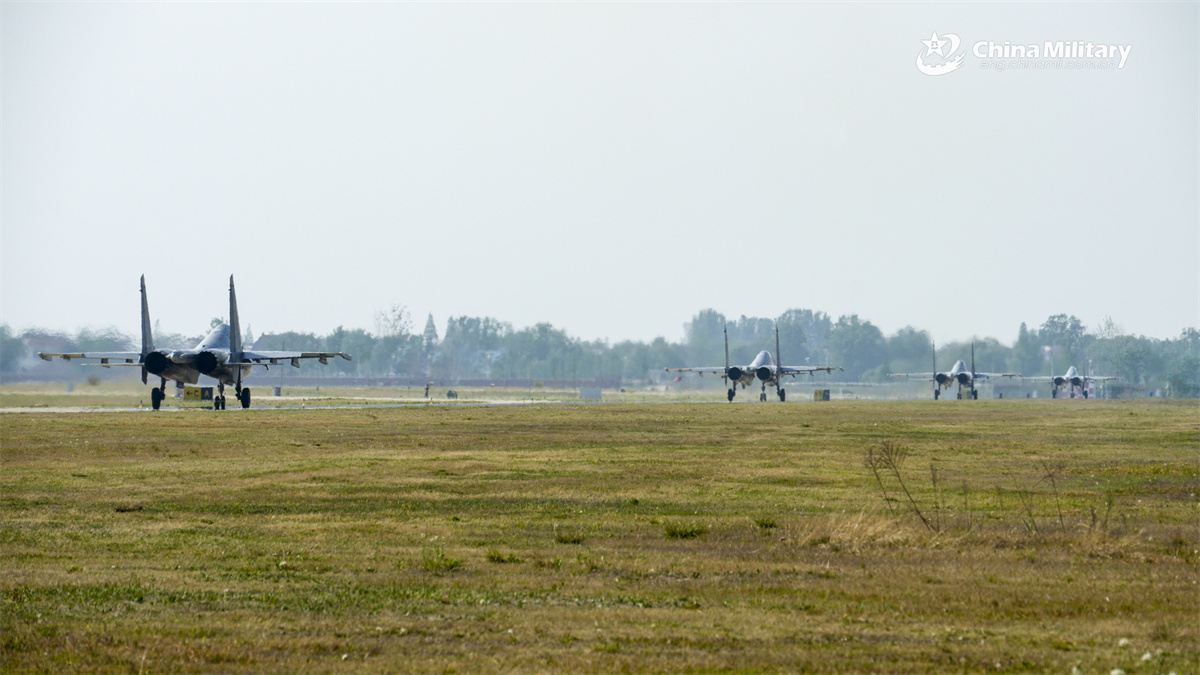 J-16 multi-role fighter jets attached to an aviation brigade with the air force under the Chinese PLA Eastern Theater Command taxi on the runway during a flight training exercise in mid-April, 2025. (eng.chinamil.com.cn/Photo by Zhu Yunlong)